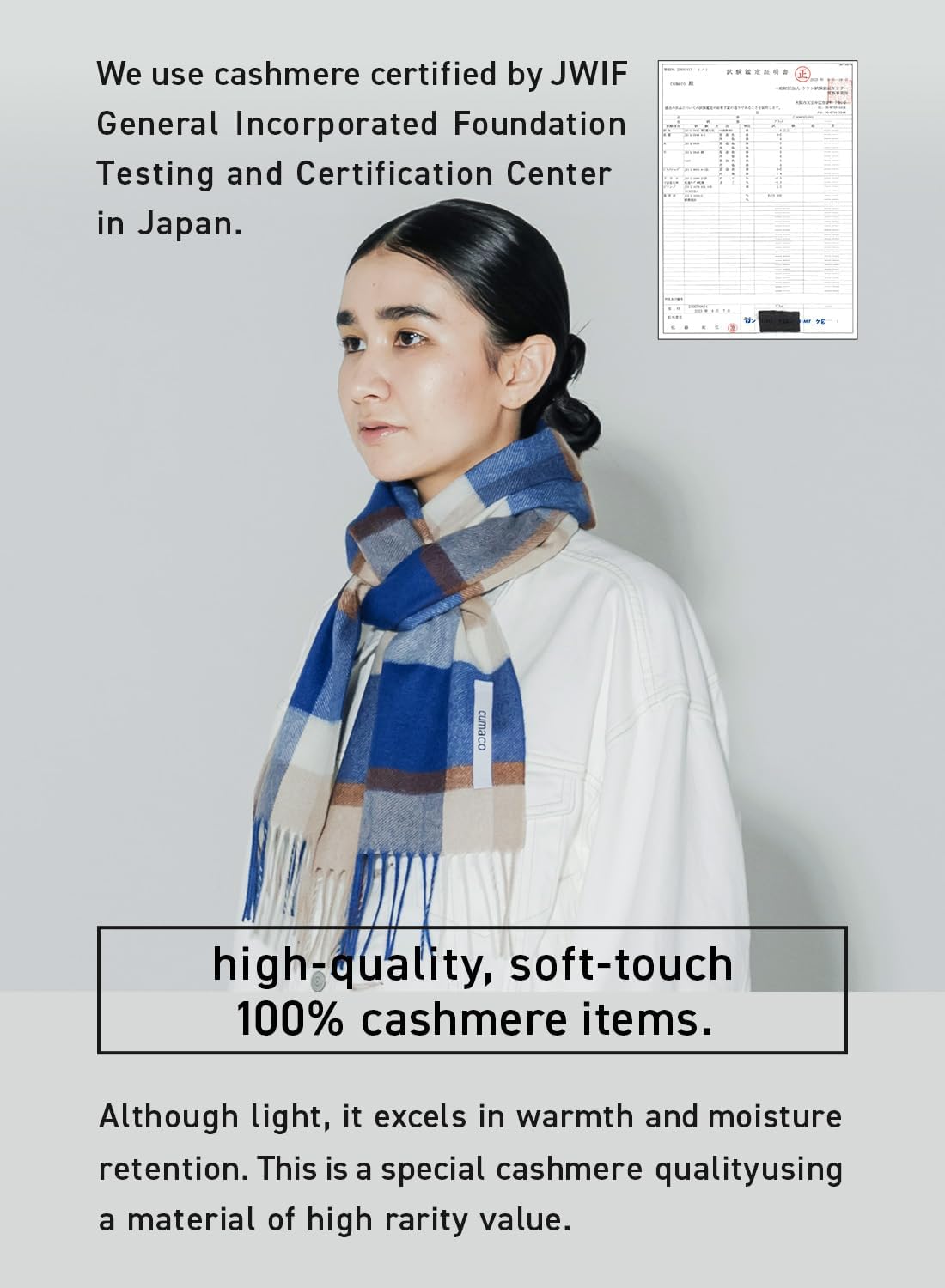 Cumaco is created with the intention of supporting users’ curiosity, hoping to enhance daily fashion to be more sophisticated. We offer various items like cashmere scarves and cashmere stoles, all spun in factories in the Inner Mongolia Region of China, where strict quality and production control are maintained.