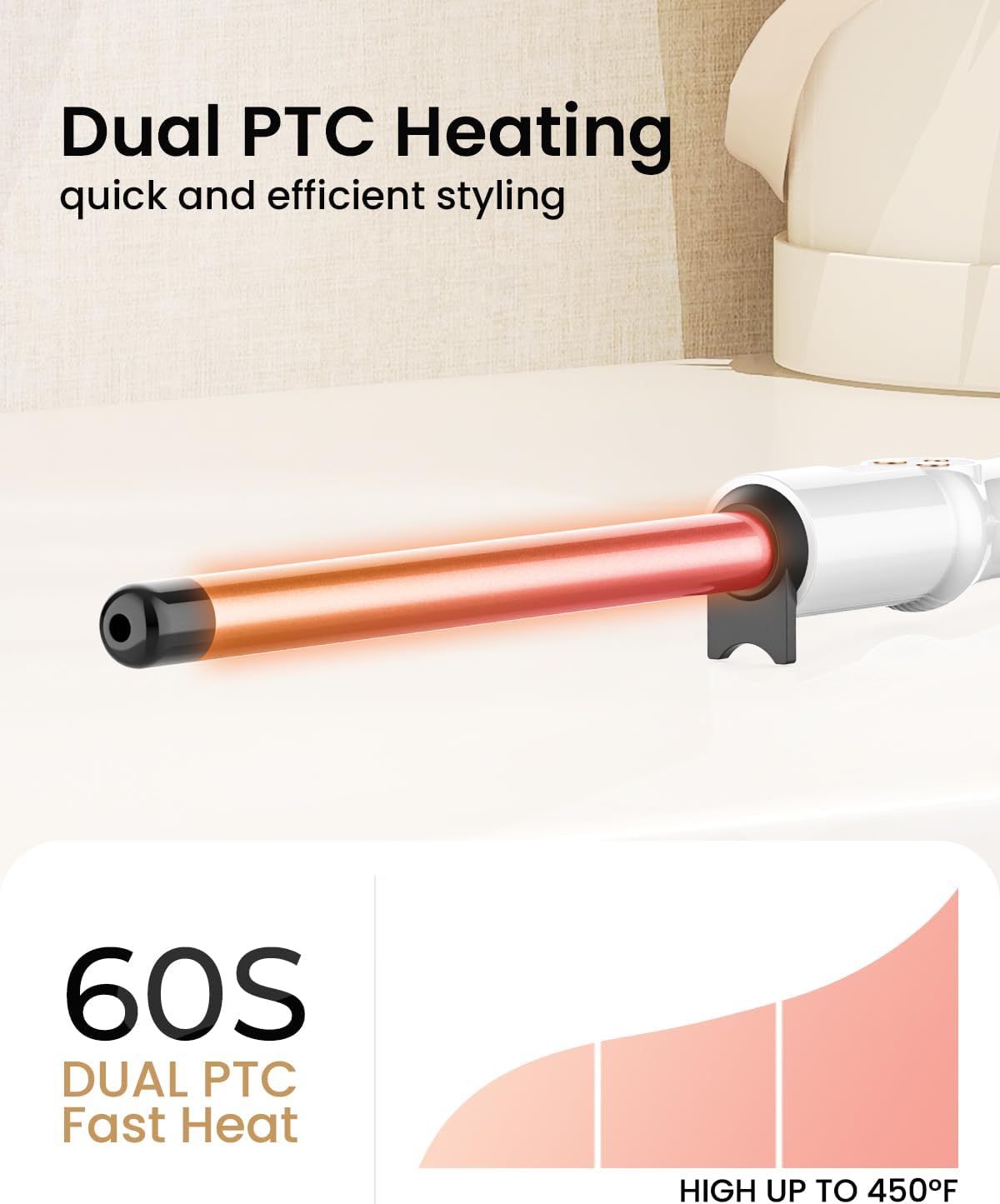 Rapid Heating in 60 Seconds & 11 Heat Settings: The curling iron’s barrel is equipped with Dual PTC technology, heating up in just 60 seconds. It ensures fast and even heat distribution, allowing you to curl your hair within seconds. With 11 adjustable heat levels ranging from 225 to 450℉, it caters to all hair types, providing the perfect temperature for styling.