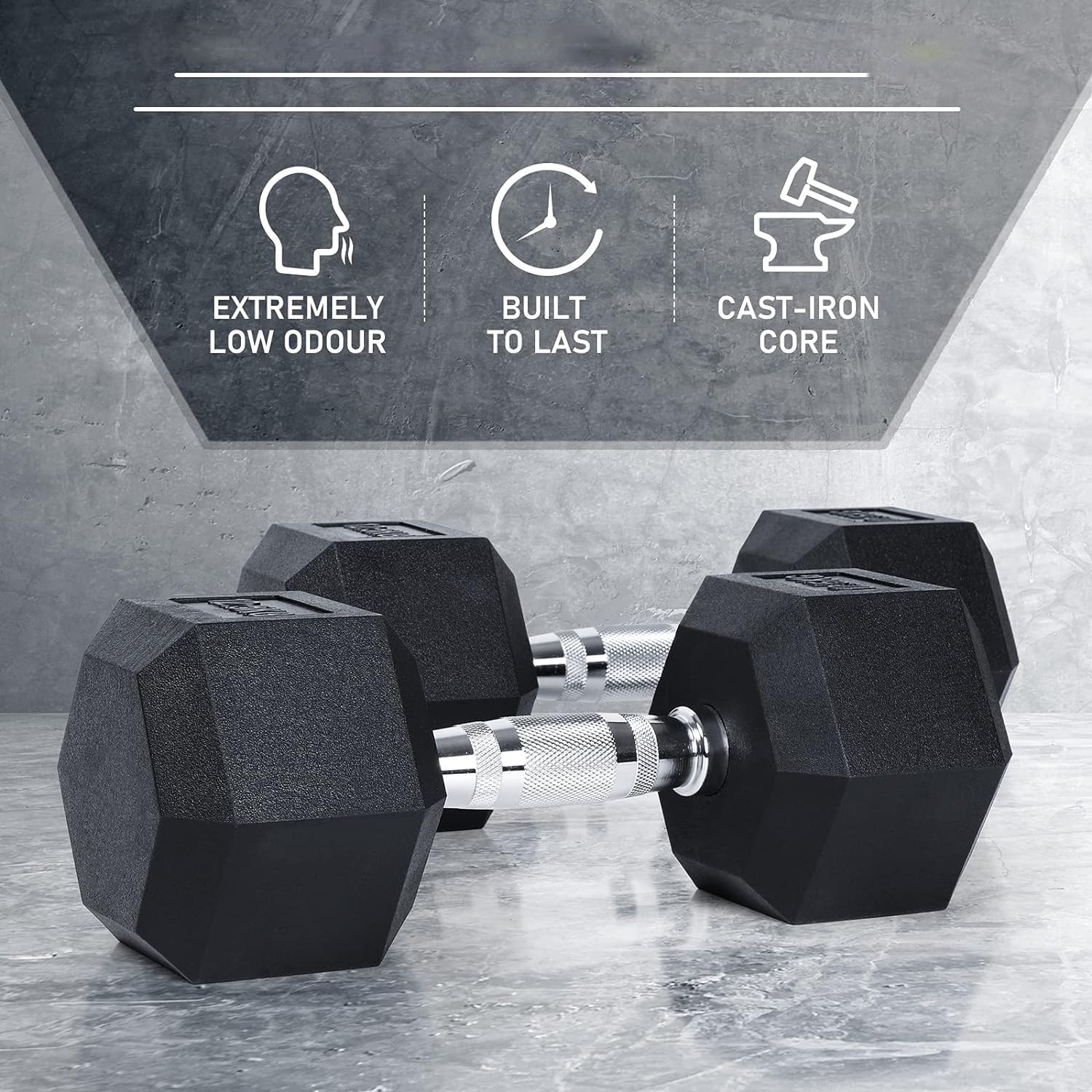 Quality Materials: The dumbbells are made of solid cast iron, ensuring strength and durability even with repeated use. The rack is constructed from steel and coated with a durable black powder coating, guaranteeing longevity and resistance to wear and tear.