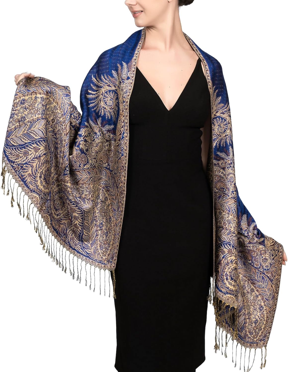 Available in 30+ beautiful vibrant colors and finished off with classic tassels, this exotic big paisley pashmina shawl wrap will accent your casual to cocktail attire.