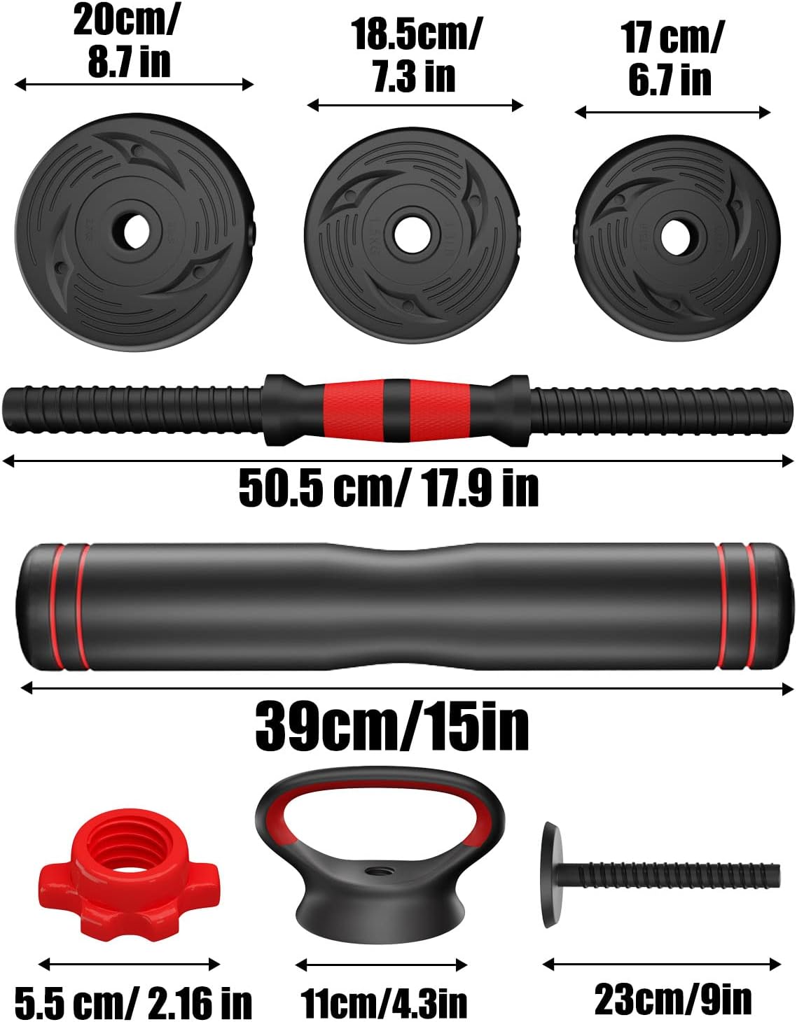 【Simple & Durable Training Equipment】: This weight set can easily change from dumbbell to barbell. (The package includes 4pcs x 4.4lbs weight plates,4pcs x 3.3lbs weight plates,4pcs x 2.75lbs weight plates, 4pcs x End Nuts,2pcs x Dumbbell Bar,1pcs x Thick Barbell Bar, 2pcs Kettlebell handle and 1pcs Kettlebell base ) Easily change and work for fitness.