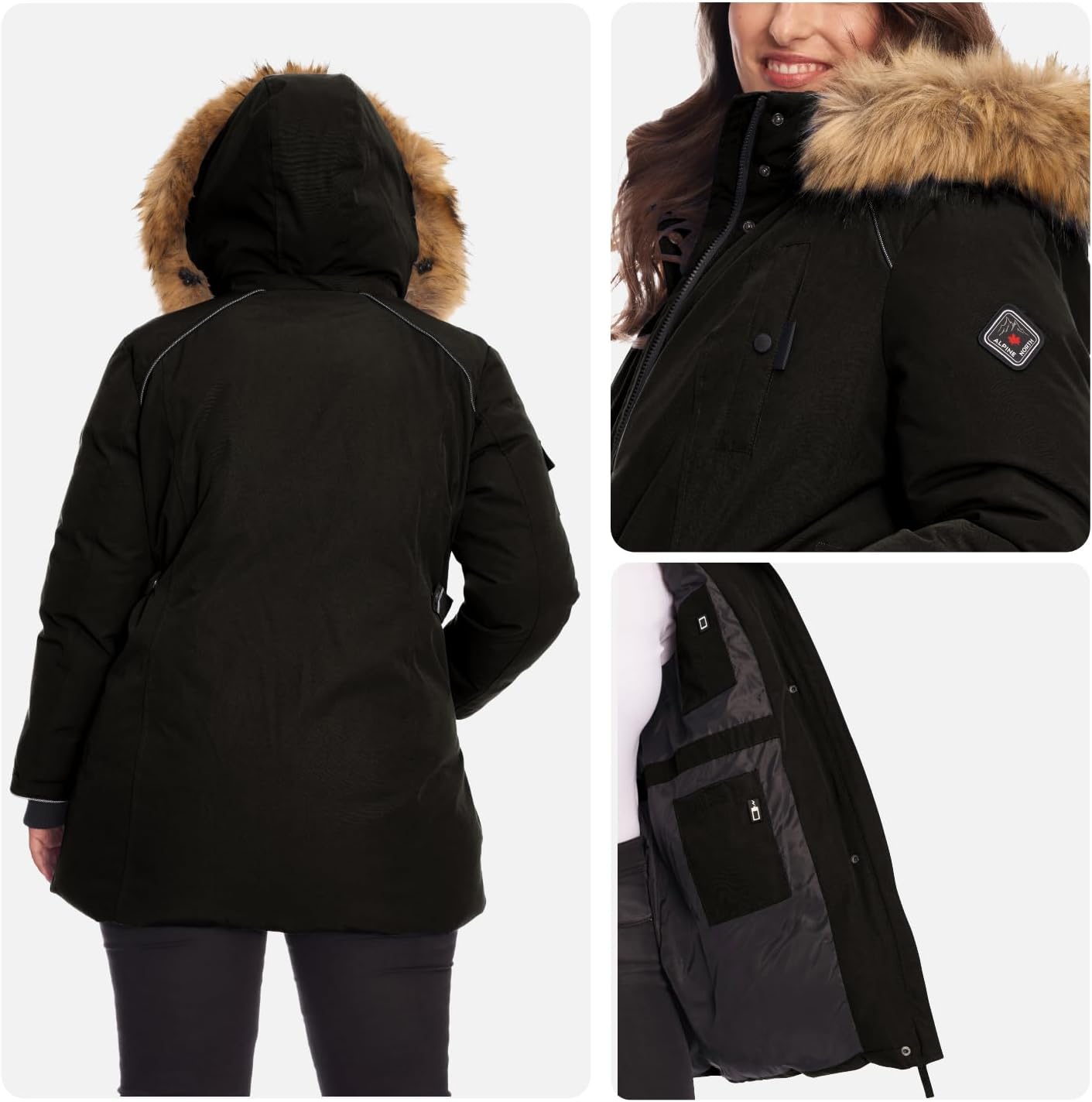 The Alpine North tried, true, and trusted mid-length plus parka coat is now offered in vegan down! this is one of our warmest and most popular styles for true winter. The detachable hood is adorned with fashionable vegan fur that will highlight your look while you are out and about. You can adjust the side waist tabs to create a trendy and modern look that will highlight your silhouette. There are 4 front welt pockets, 1 sleeve pocket and 2 inside pockets to secure your phone, wallet, keys and more. For even warmer protection against the wind and cold, knit storm cuffs with thumb openings line the sleeves. This style and design is a great addition to your outdoor wardrobe.