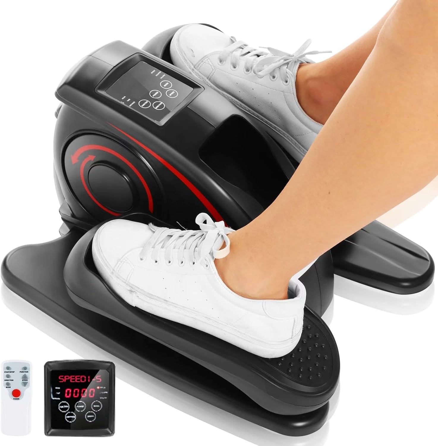 [Multiple Movement Function]Depending on your needs and abilities, under desk elliptical trainer has Auto (P1-P3) & Manual (5-levels speed) for your choice. Pedals can forward or backward to target different muscles. Note: only use it while sitting