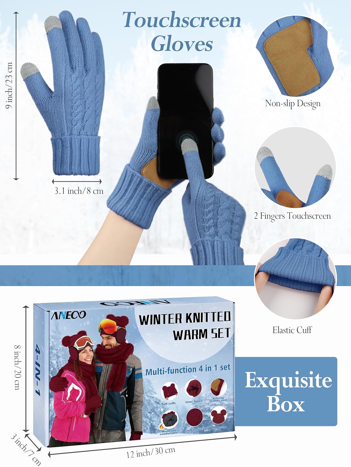Aneco Women Winter Beanie Hat Scarf Gloves Set Warm Fleece Cap with PomPom Knit Anti-Slip Touchscreen Gloves for Cold Weather