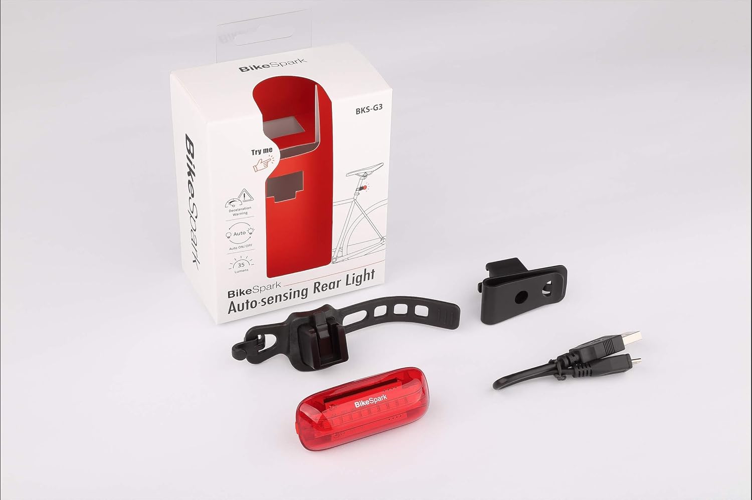 BikeSpark Auto On/Off by Motion Sensing TechnologyAfter charging the battery, simply press and hold the control button for 1.5 seconds to turn it on. You are good to go for weeks.Never have to remember to turn off your rear light again! BikeSpark turns off automatically after 1 minute of inactivity, and turns on when motion is detected. The perfect balance of convenience, battery life and riding safety.With the Normal Flash Mode, BKS-G3 can last for 40 HRs on one charge.