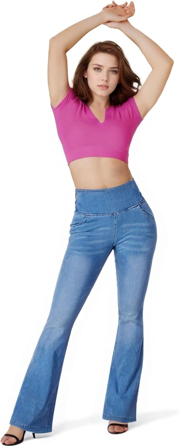 BlueRose Knit Stetchy Flare Jean Women, Flare Leggings with Pockets Crossover High Waisted Bell Bottom Yoga Pants