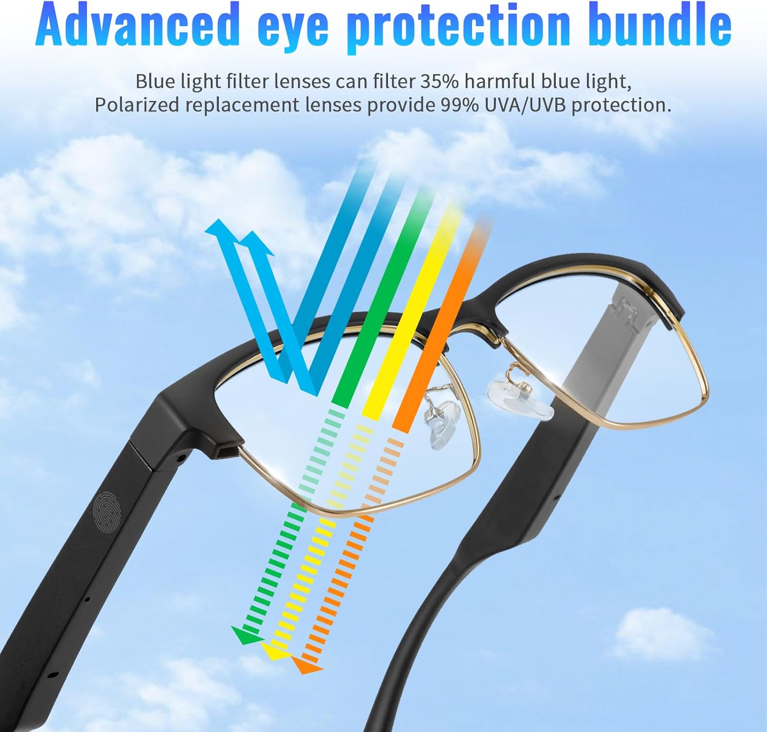 Blue Light Filter / Polarized Lenses: Our glasses come with bule light flier and polarized lenses which the blue light fliter will filters 35% of harmful blue light to reduce screen glare and polarized lences protects your eyes from 99% of the ultraviolet rays.Our frames audio bluelight glasses has a detachable front frame so you can switch between polarized sunglasses and blue light filtering designs at any time.