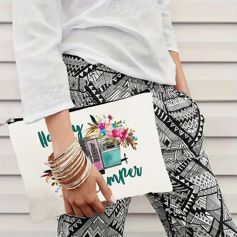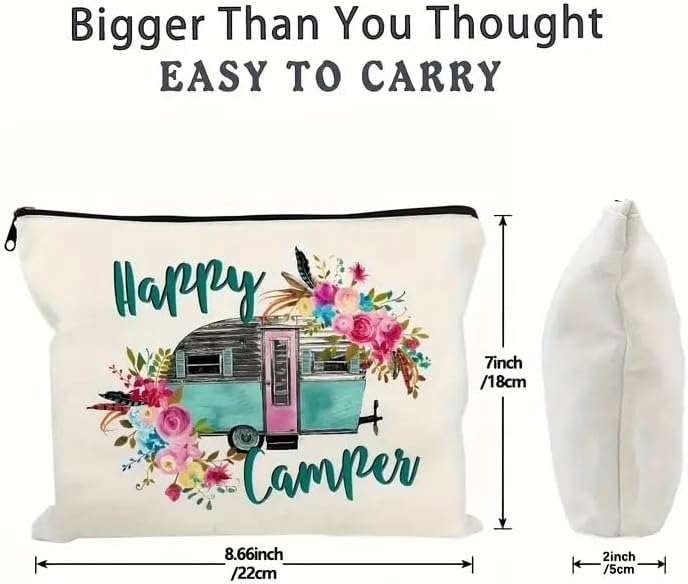 Camper Accessories for Travel Trailers RV’s – Happy Camper – Campfire Makeup Bag Gifts Retro Vintage Camping Fun Traveling Adventures Vacation Makeup Bag Cosmetic Organizer Coin Travel Bag Purse