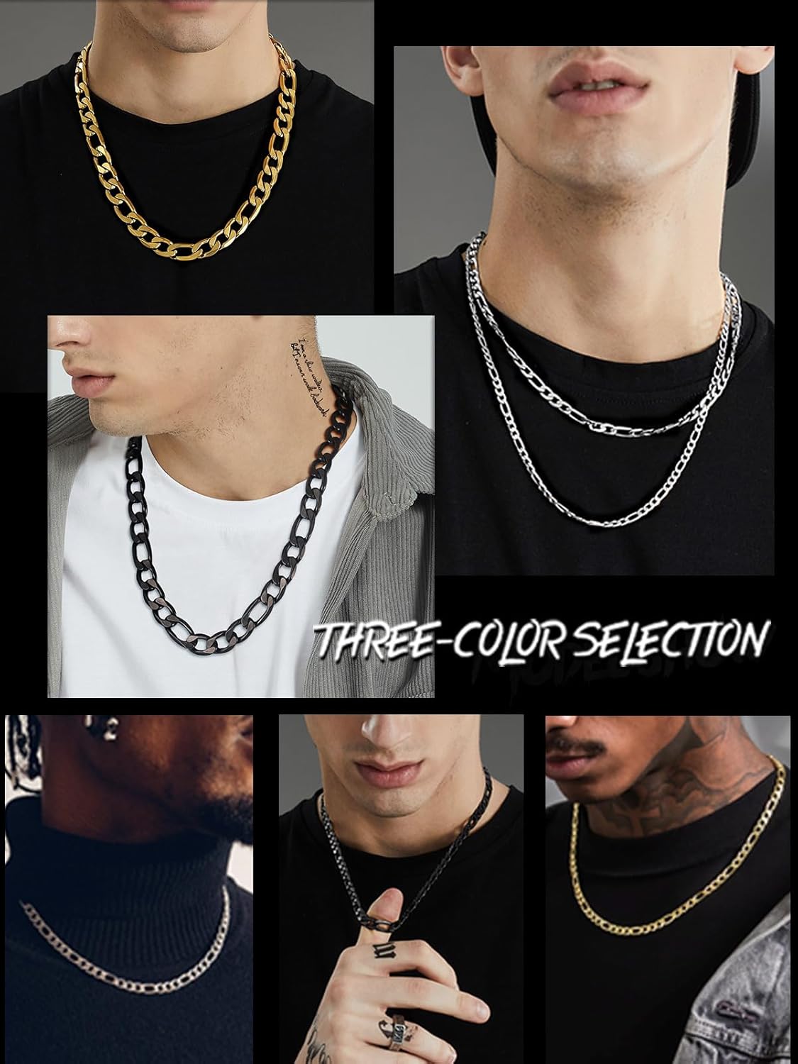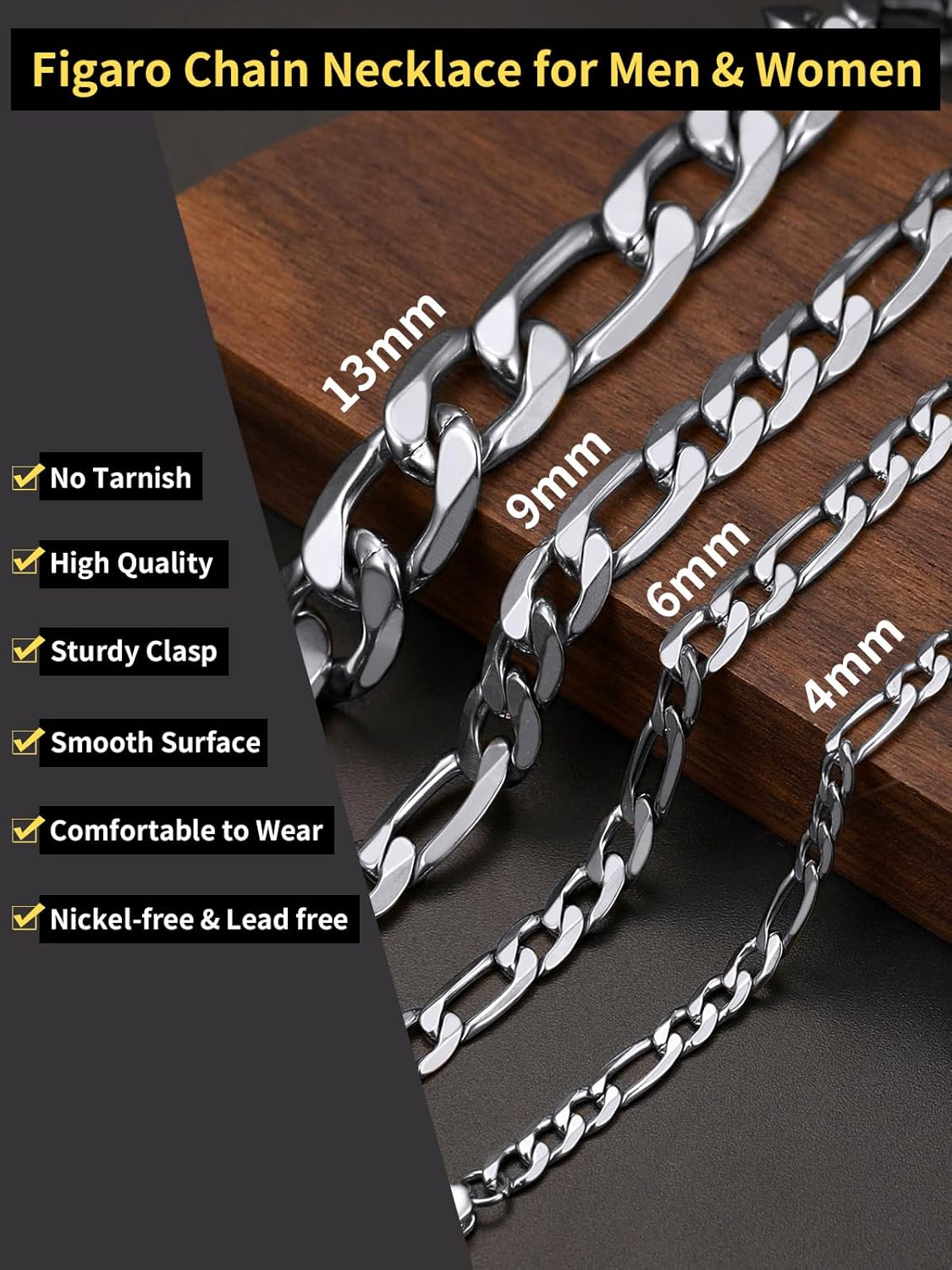 ChainsHouse Stainless Steel Figaro Chains for Men Women, 3mm/4mm/5mm/6mm/7mm/8mm/9mm/13mm Width, 14-30inch Length, Black/18K Gold Mens Necklace Chains, Send Gift Box