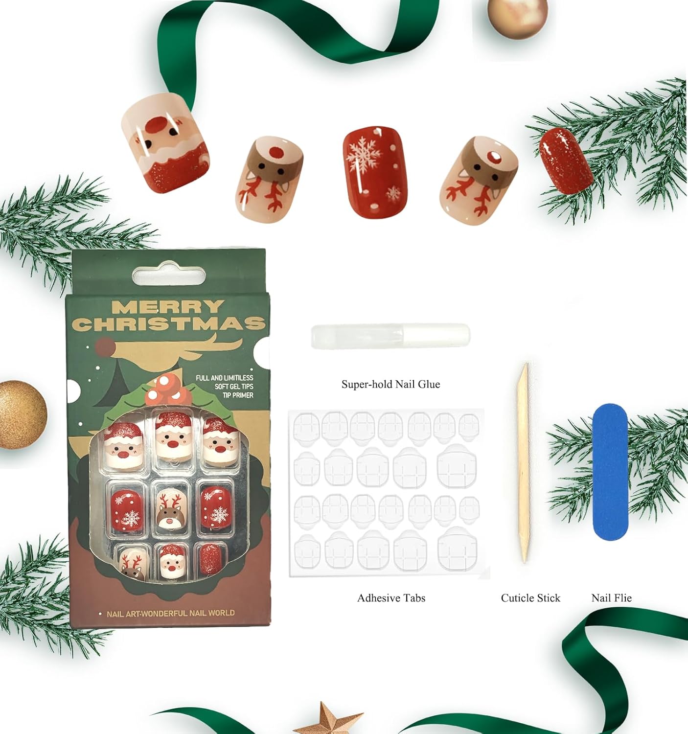 Christmas Nails Press on for Women, 24pcs Fake Nails Womens Gifts for Christmas, 12 Size Square Press on Nails Short with Glue & Adhesive, Reusable Nails with Elk Snowflake Santa Claus Pattern