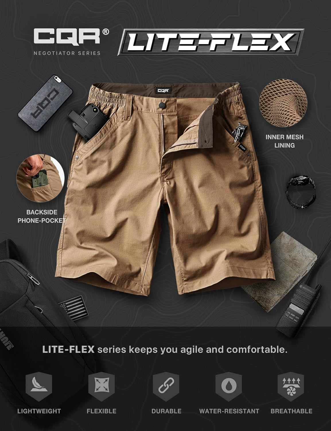 CQR Men’s Flex Casual Cargo Shorts, Lightweight Water Resistant Golf Shorts, Stretch Tactical Work Shorts with Multi-Pocket