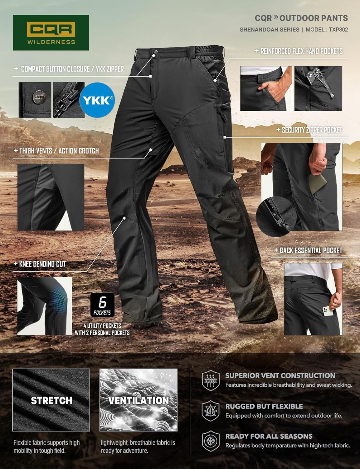 CQR Men’s Vent Stretch Pants, Quick Dry Lightweight Casual Cargo Pants, Water Resistant Straight-Fit Utility Work Pants