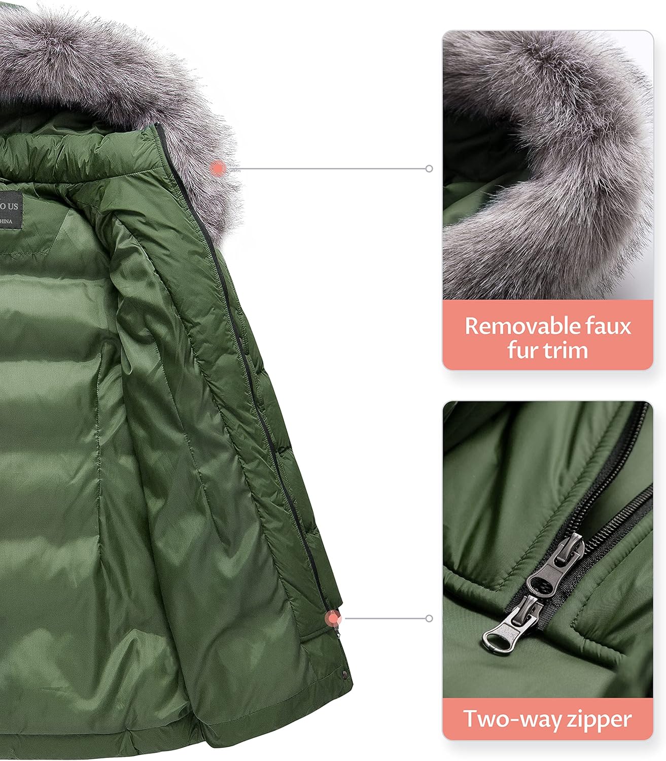 CREATMO US Women’s Winter Snow Jacket Long Fur Puffer Coat With Removable Faux Fur Trim