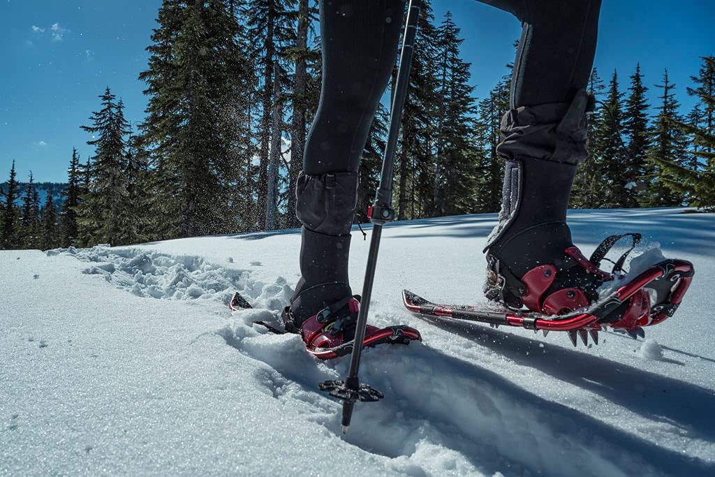 Quiet: The decking is lightweight, durable, highly abrasion resistant, and quiet, noticeably different from plastic snowshoes. They are 27″ x 9″, 4.5lbs per pair, recommended for up to 195 lbs.