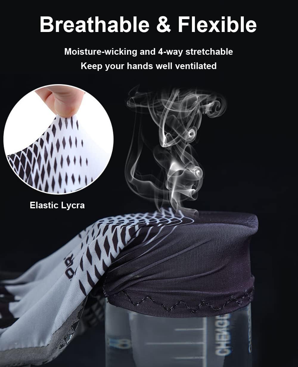 The bike gloves are made using a moisture-wicking, highly breathable Lycra fabric that keeps your hands cool and dry while biking.