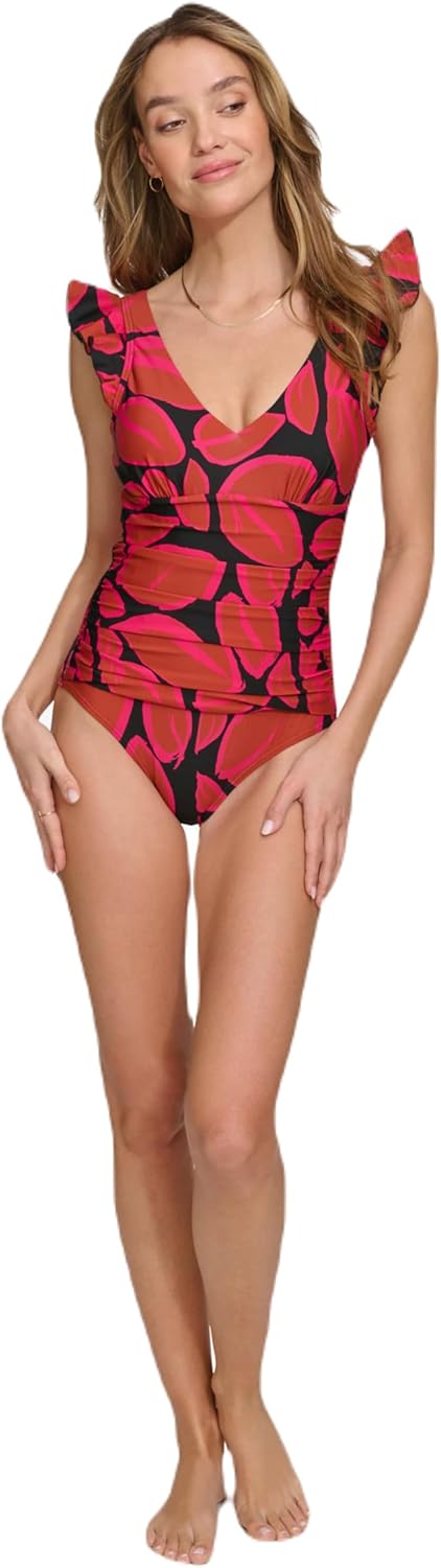 DKNY Women’s Ruffle Shoulder V-Neck One Piece Swimsuit