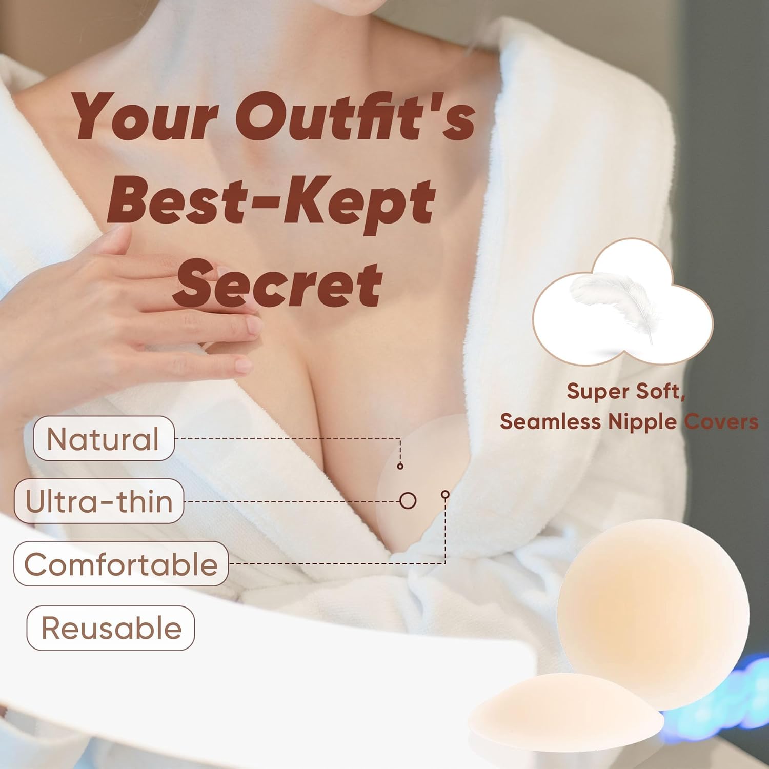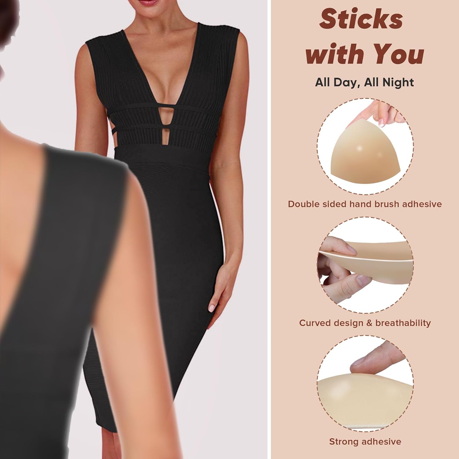 Double-Sided Adhesive Bra Invisible Inserts:Delicate and soft, fits well without irritating the skin.Triangular design fits snugly:Conforms to the breast curve, small and invisible, upper body concave S curve.Waterproof and sweatproof:Upgraded adhesive, cool and not stuffy, 10 hours of stable fit.Reusable and washable:A set of bras and nipple covers are washable and reusable.