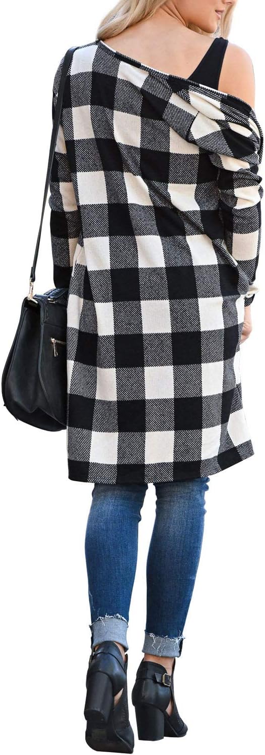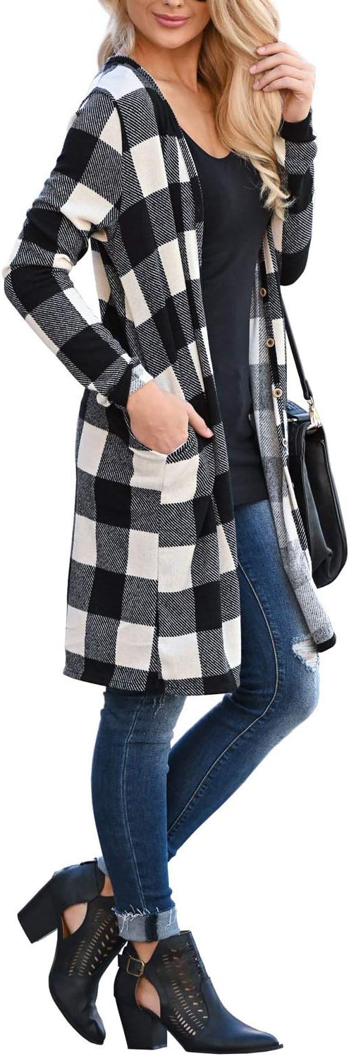 Dressmine Womens Long Cardigan Open Front Buffalo Plaid Shirt Knitted Coat Outwear Maxi Sweater Trendy 2024 Tops