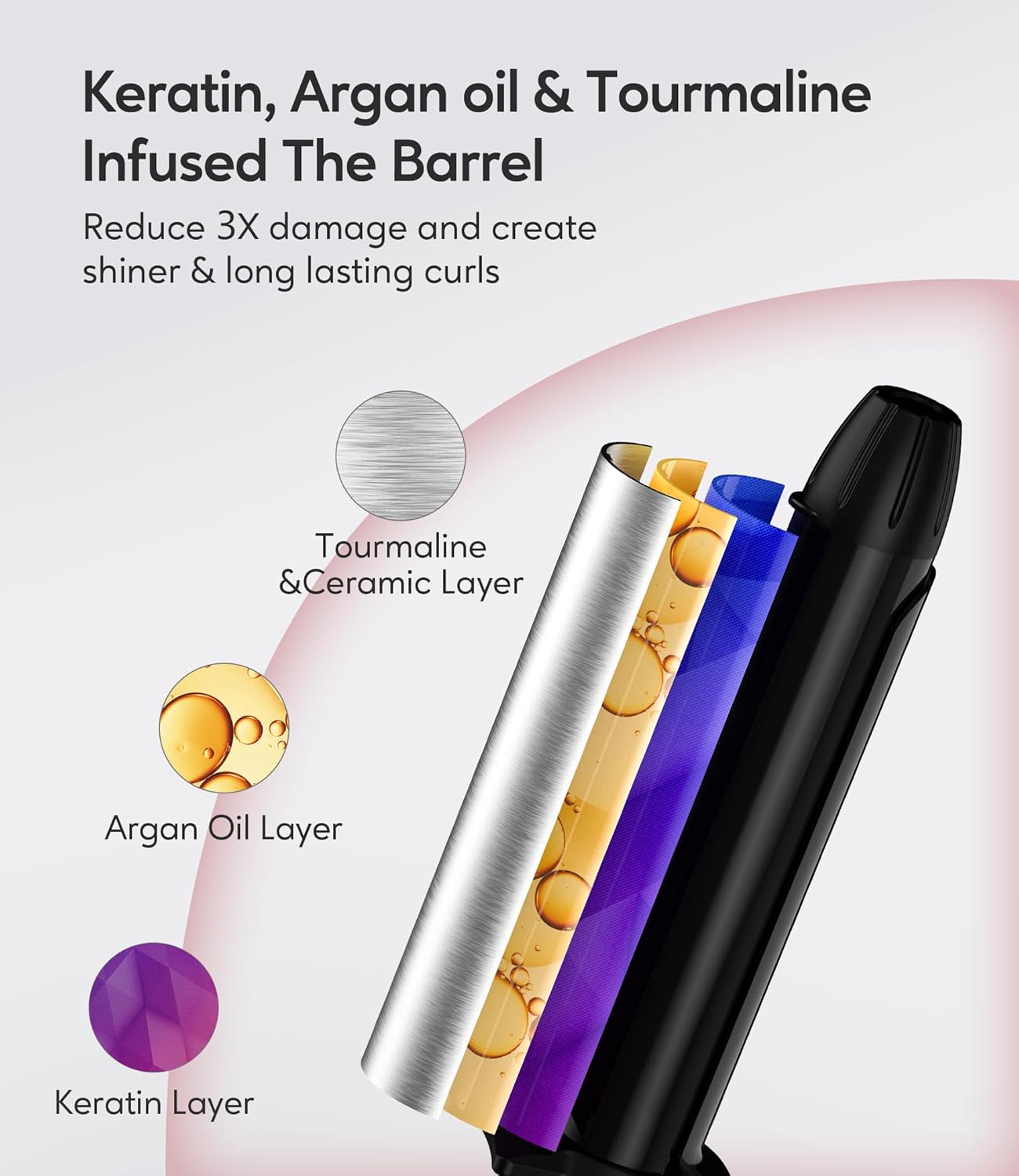 [EASY TO USE & GET SHINY LONG LASTING CURLS] Farery ceramic mini hair curler for short hair with Keratin, Argan oil & Tourmaline infused the barrel, releasing millions of nourishing properties negative ions providing ultra-shiny and more polished curls. The ceramic barrel distributes heat evenly to prevent damage and disperse negative ions which keep hair smooth and shiny