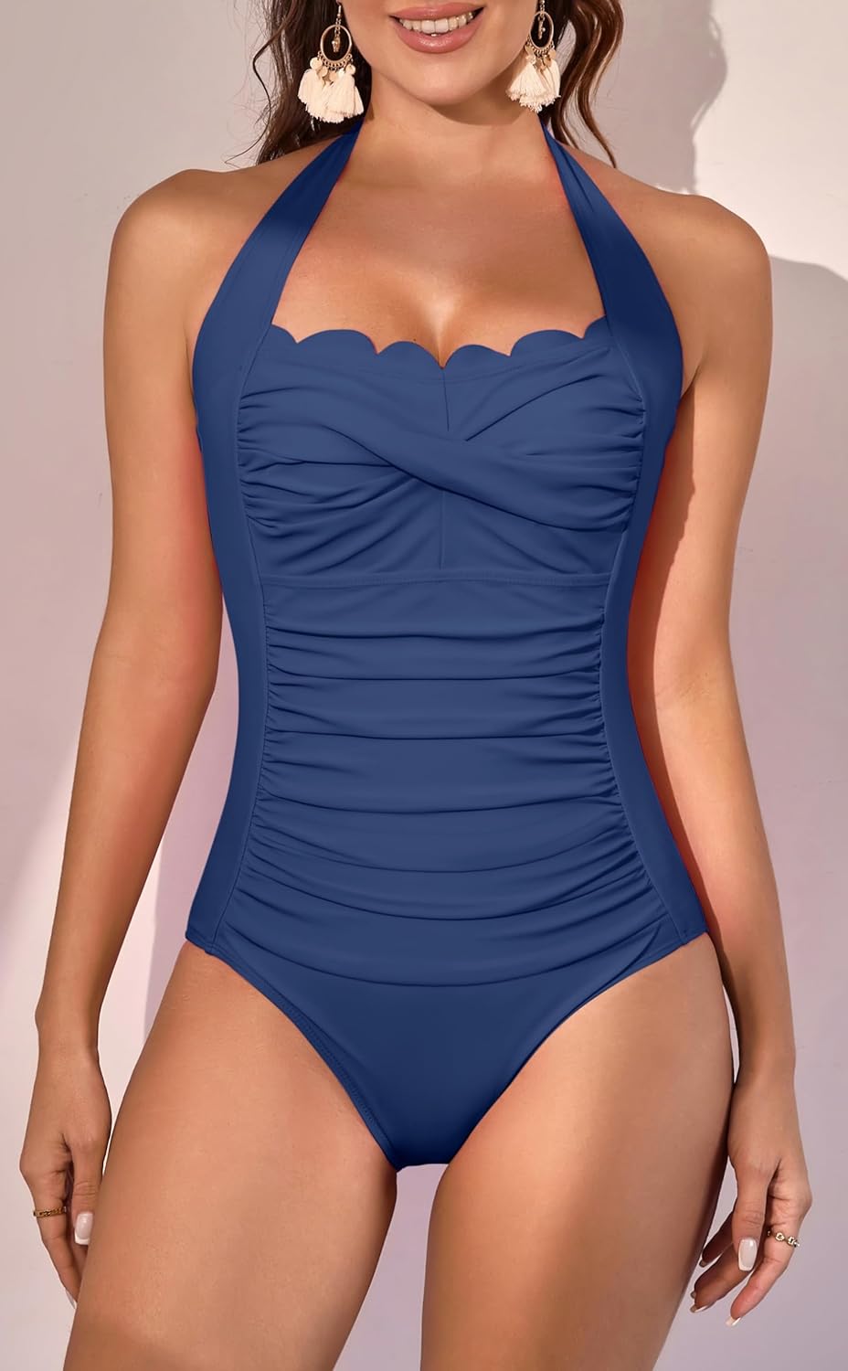 Eomenie Women’s One Piece Tummy Control Swimsuit Halter Scallop Trim Bathing Suits 1 Piece Vintage Ruched Slimming Swimwear