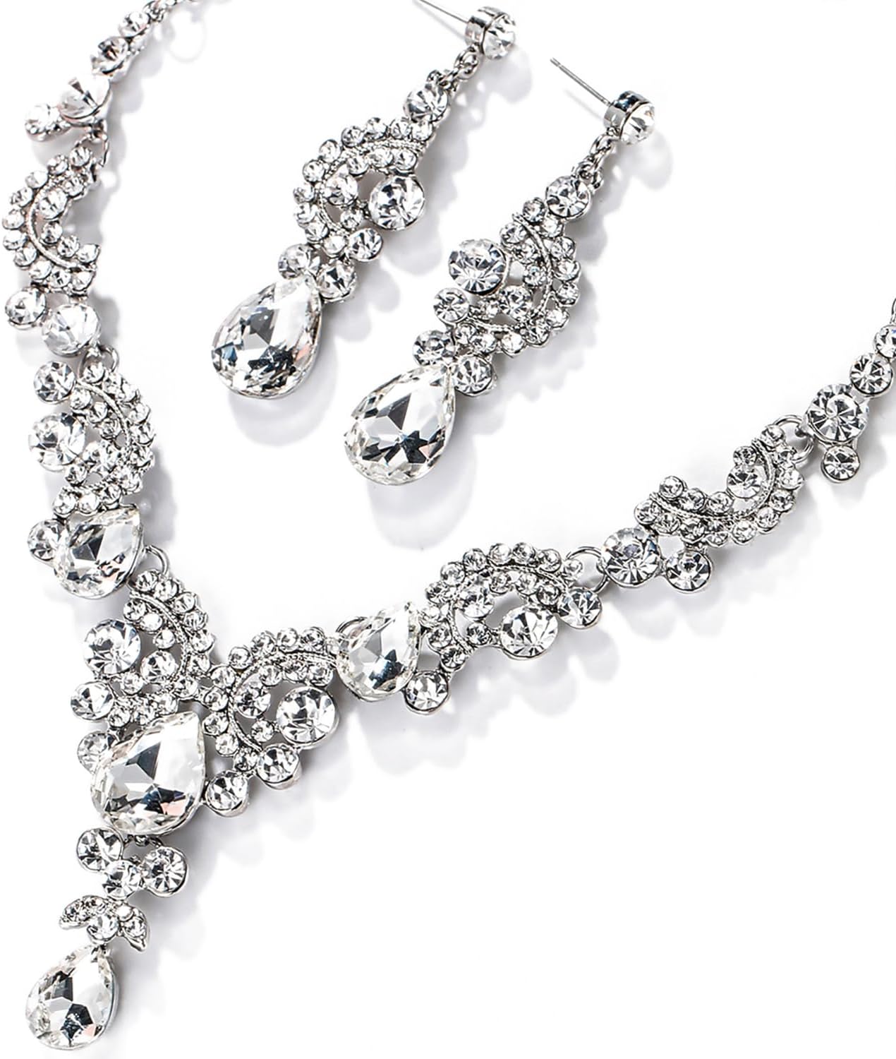EVER FAITH Rhinestone Crystal Bridal Floral Wave Teardrop Necklace Earrings Set