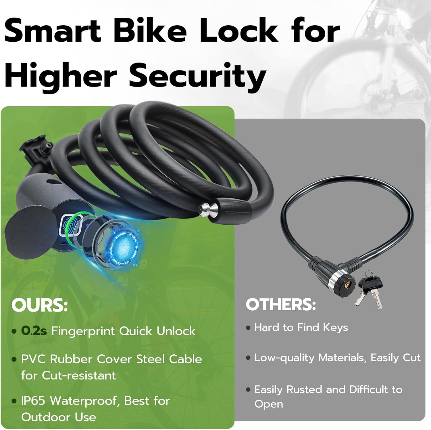 【Wider Use】Sliding cover can better protect the fingerprint area from breakage outdoors and easier to use for a long time. The bike lock cable etronic lock can be safely used for bicycles, motorcycles, scooters, baby strollers, school, office, fence, garage, large luggage and other items that need to be locked, whatever Indoor and Outdoor.