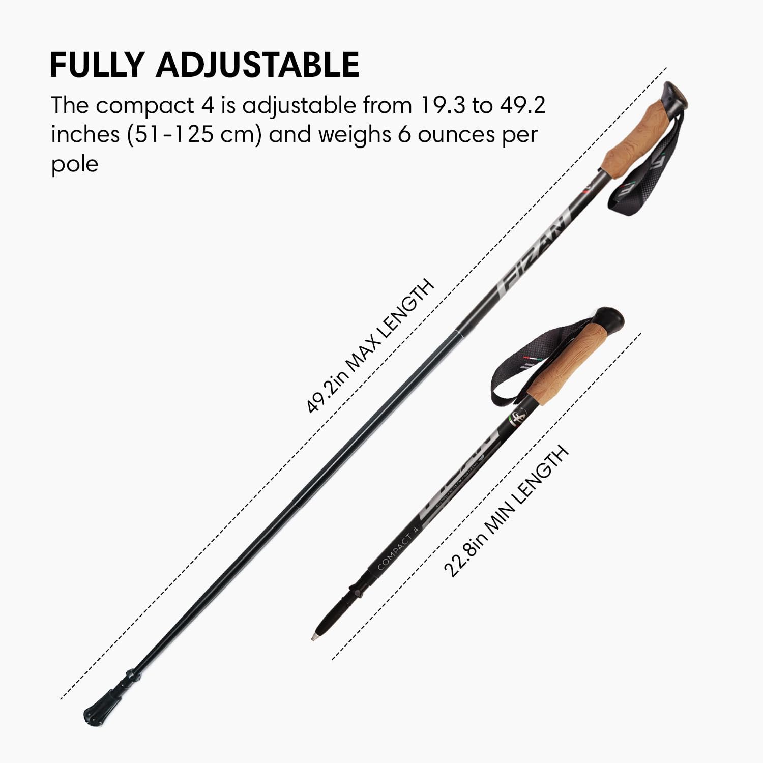 Collapsible, adjustable & ultralight: the compact 4 is adjustable from 19.3 to 49.2 inches and weighs 6 ounces per pole. replaceable carbide tips for traction on dirt trails and metal-reinforced, rubber tip covers for rocky trails.