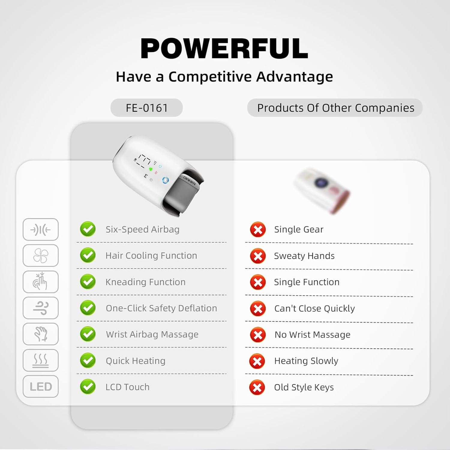 【Cooling Fan & Adjustable Heating】Experience Comfort Year-Round! This wireless hand massager has an unique built-in fan, ensure a dry and comfortable hand massage in the hot day. Also equipped with adjustable heating function (Low: 107.4°F, High: 118.6°F). Relieves muscle soreness, numbness, and cold fingers and palms