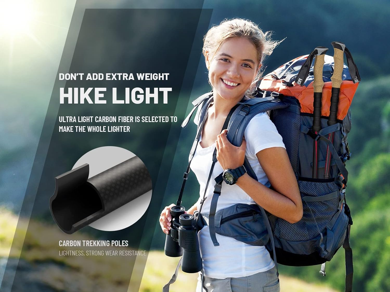 ✅【STRONGER MATERIAL】-Our products have been innovated and transformed for more than ten years. This Trekking pole is made of carbon fiber. Compared with aluminum alloy, it is lighter and stronger. It will not break after many years of use. It is corrosion-resistant and protects you from safer use outdoors.