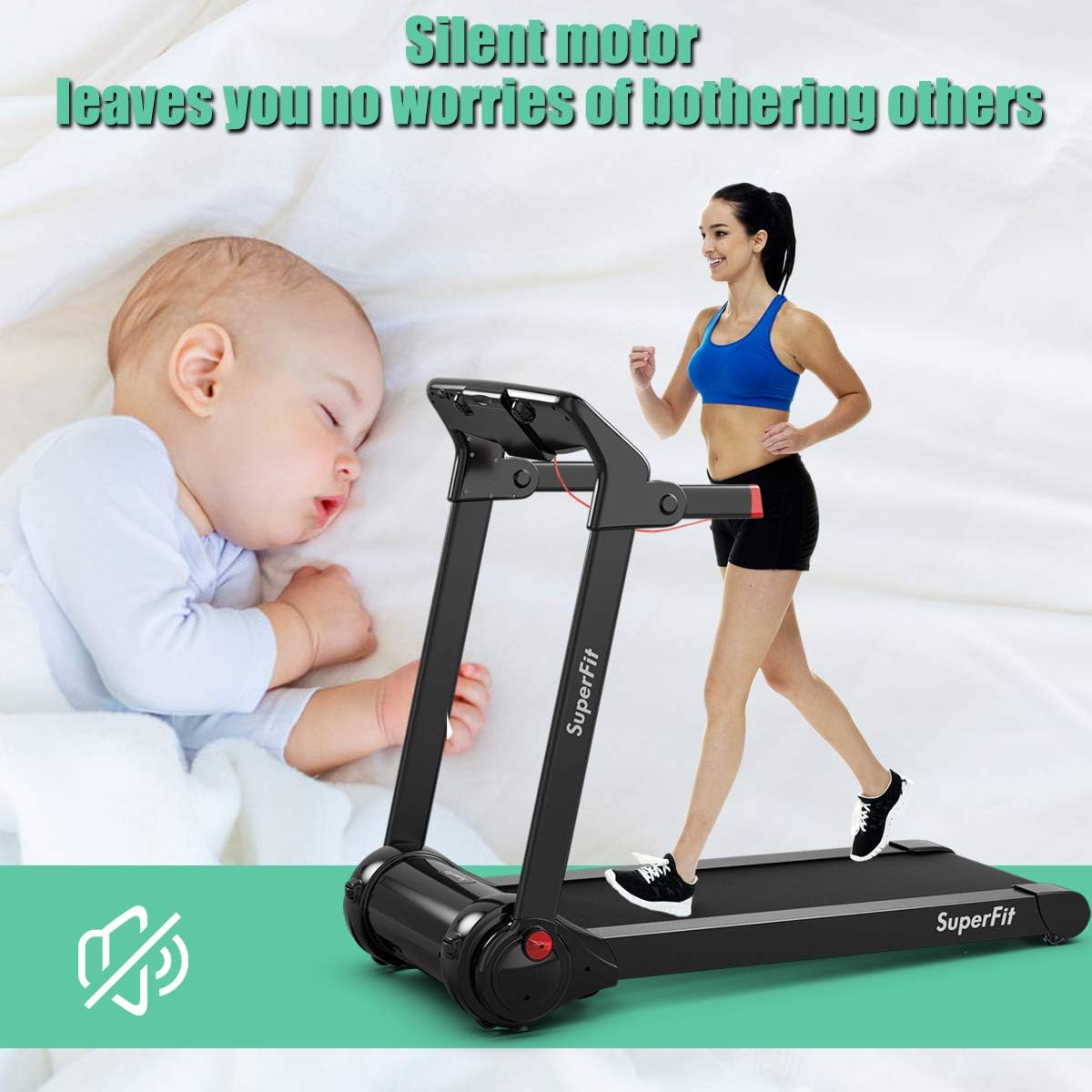 【Foldable & Moveable Treadmill】This compact treadmill can be easily folded up by switch the side knobs and occupies little space, making it easy to store at home. What’s more, the built-in transport wheels at the bottom make the treadmill easy to move, saving your energy and time. Please do not use the treadmill on carpet to avoid overheating