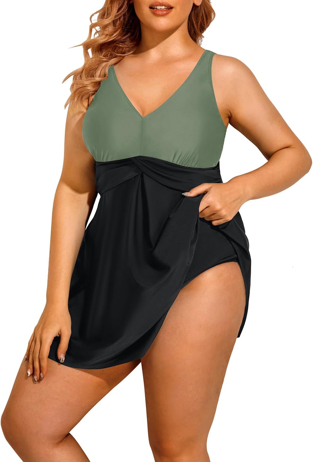 Holipick Plus Size Swim Dress Women – One Piece Swimsuit with Skirt V Neck Tummy Control Bathing Suit