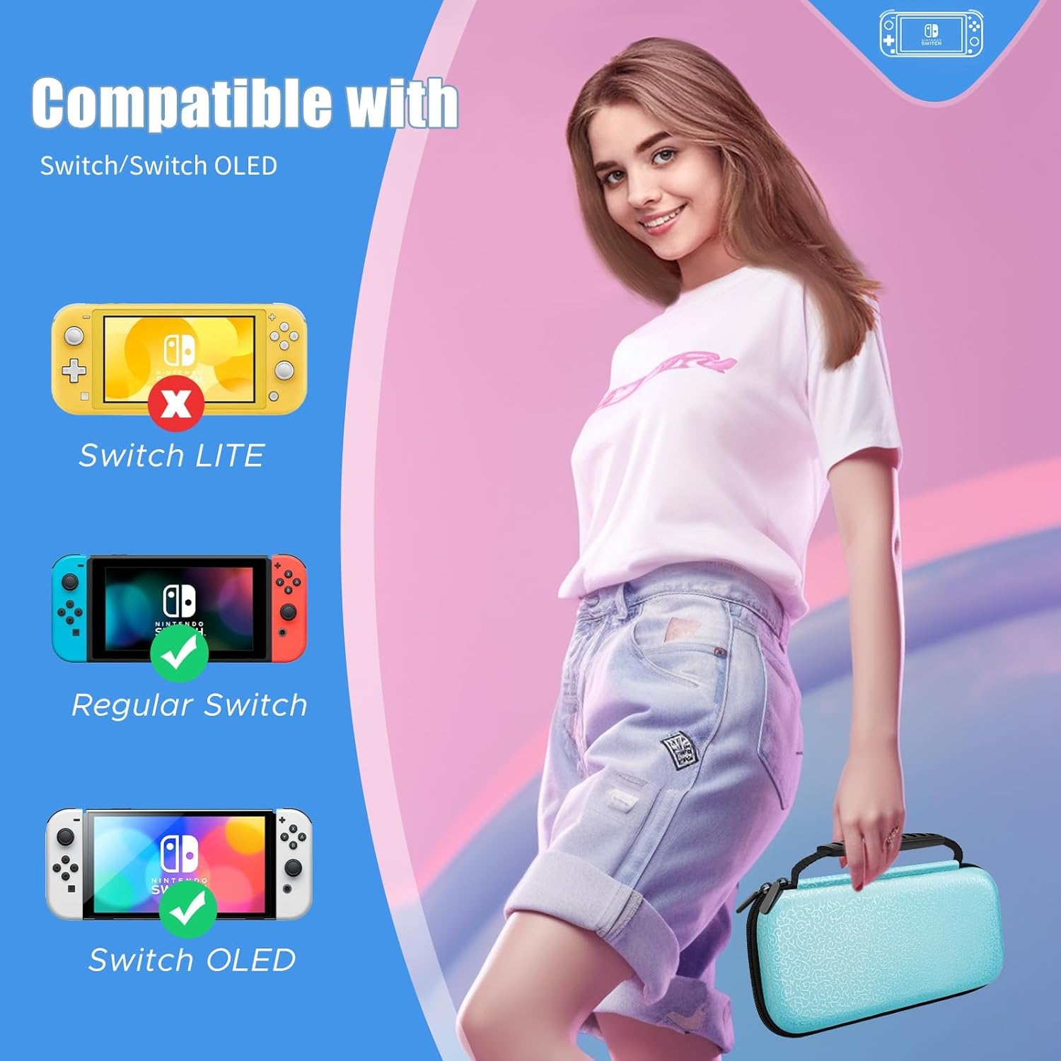 Protection Case for NS/NS OLED Version–Hard EVA shell protects the Nintendo Switch from accidental bumps, drops and scratches.The soft Interior protects the Switch from everyday wear and tear.The Switch carrying case for girls is compatible with OLED Model (2021) 7.0 Inch / Nintendo Switch (2017) 6.2 Inch.