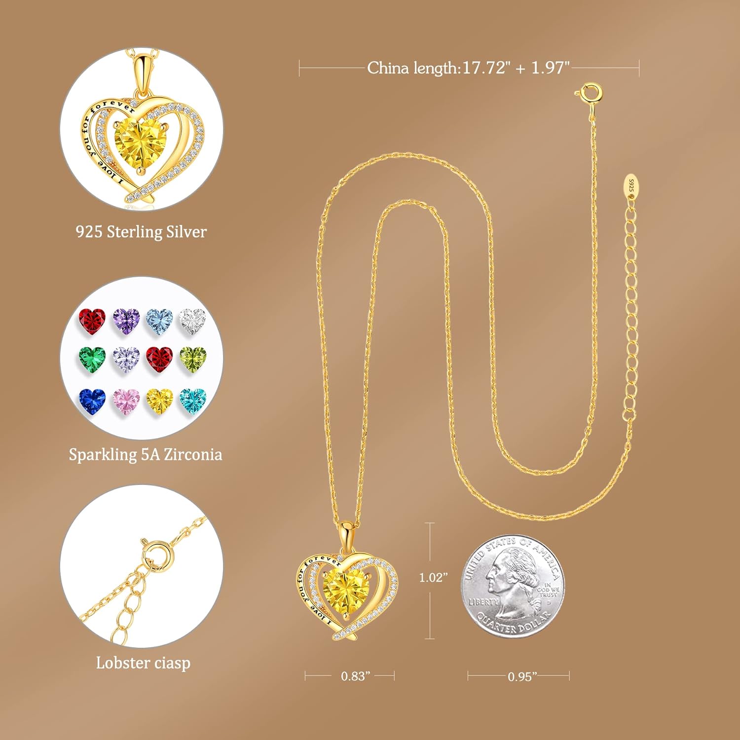 I Love You Heart Necklace Sterling Silver Birthstone Pendant for Women, Wife, Girlfriend, Mother Valentine’s Day Jewelry