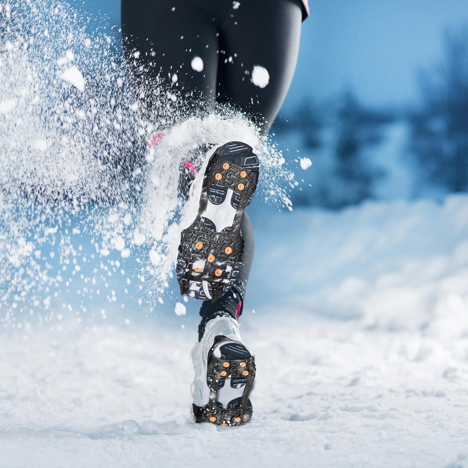 GREAT TRACTION: The ice cleats made of durable and thick tungsten carbide studs, which is abrasion resistant and long-life usage. 9 spikes crampons for a great traction can reduce slipping and falling on ice or snow and give users secure foot traction.