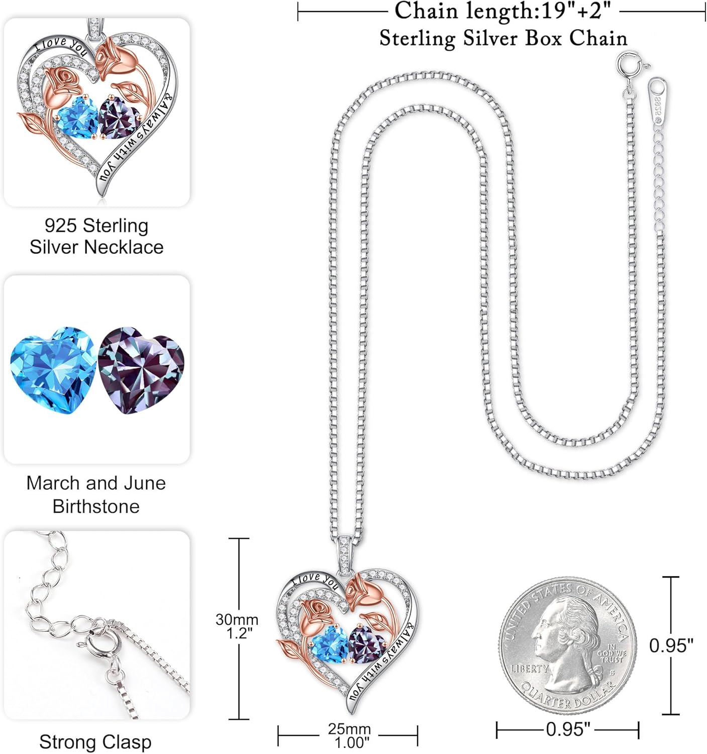 Iefil Birthstone Necklace for Women – 925 Sterling Silver Rose Heart Birthstone Necklace Birthday Anniversary Jewelry Gifts for Her Wife Mom Daughter