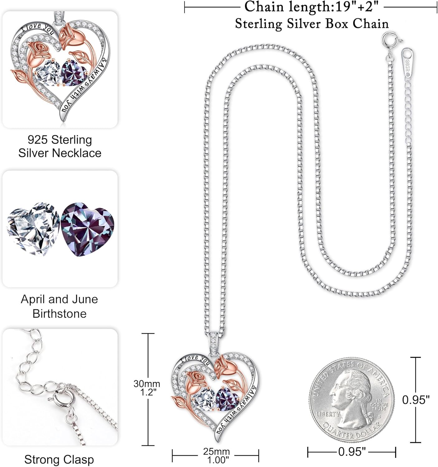 Iefil Birthstone Necklace for Women – 925 Sterling Silver Rose Heart Birthstone Necklace Birthday Anniversary Jewelry Gifts for Her Wife Mom Daughter