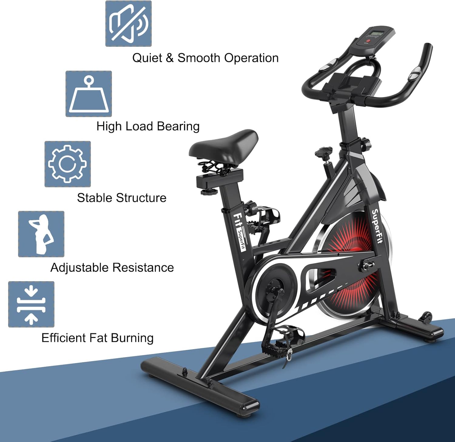 Sturdy Structure & Quiet Operation: Supported by well-selected steel frame in a stable triangle construction, this indoor cycling bike ensures high stability and can withstand up to 265 lbs. What’s more, the belt driving system with a heavy-duty flywheel offers smooth and silent ride.