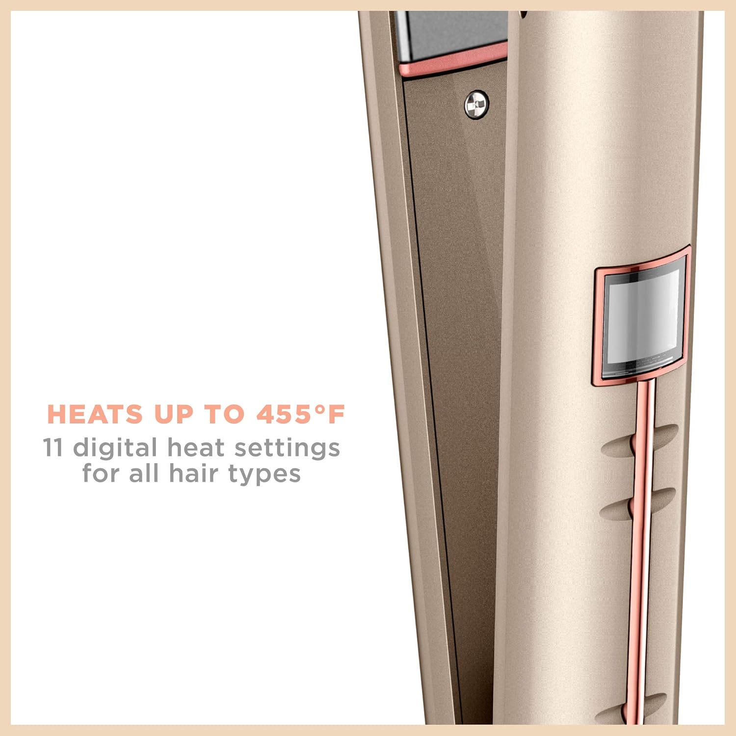 Straighten and style your hair like a pro with this high-performance flat iron. The 1-inch titanium ceramic floating plates provide even heat, eliminate gaps, and get close to the roots for ultra-straight looks you’ll love. Equipped with multiple heat settings, including an ultra-high heat of 455 Degree, this sophisticated yet simple-to-use styling tool is perfect for all hair types. A 15-second heat-up provides salon-caliber straightening without the wait. Ionic technology ensures frizz-free results, while the professional power handle gives you extra comfort and control.