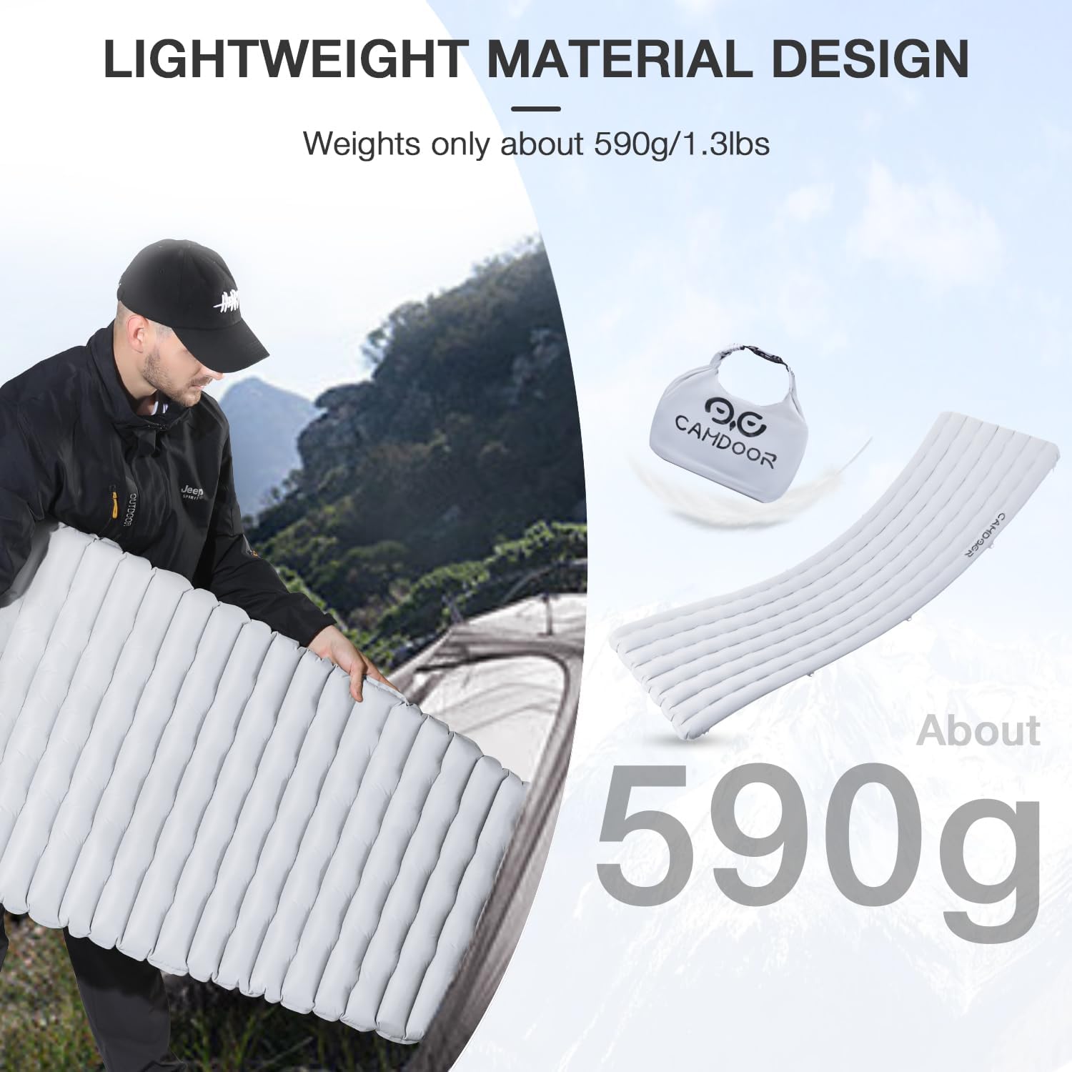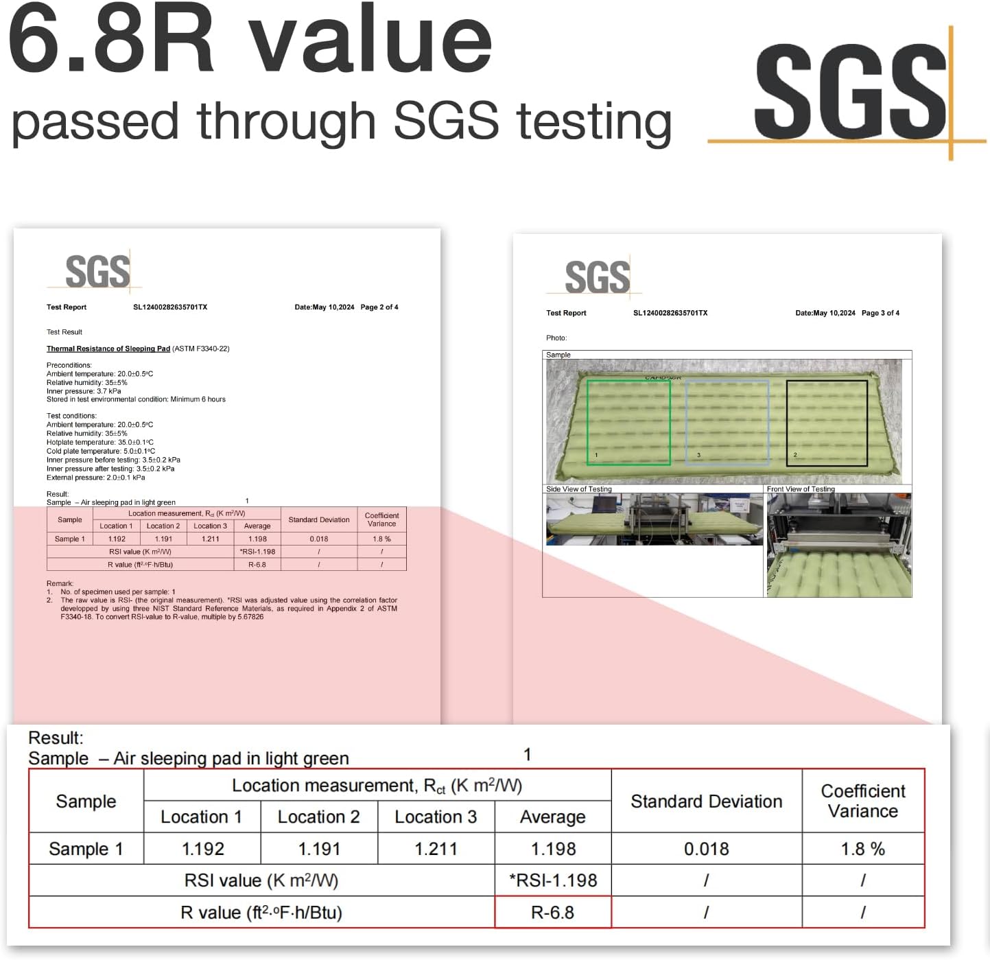 【SGS Certified High R-value】The Camdoor camping sleeping pad is SGS professionally tested and certified with a high R-value of 6.8. 3.93” Horizontal Insulating air Chambers will effectively distribute your weight on the sleeping pad camping while preventing the ground from sucking the heat out of your body, Keeps you warm in extreme weather, which makes Camdoor sleeping pad backpacking suitable for 4 season.