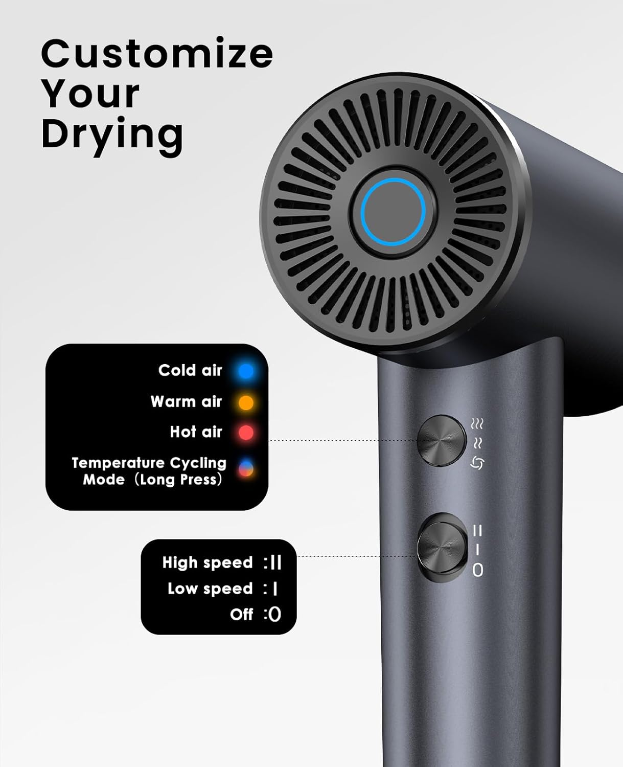 Experience Lightning-Fast Drying: The OSOU DT01 hair dryer cuts drying time by an impressive 80%. Powered by a high-speed 150,000 RPM brushless motor, it blasts a strong 36 m/s airflow to effortlessly sculpt your desired hairstyle, ensuring you breeze through your morning routine with ease