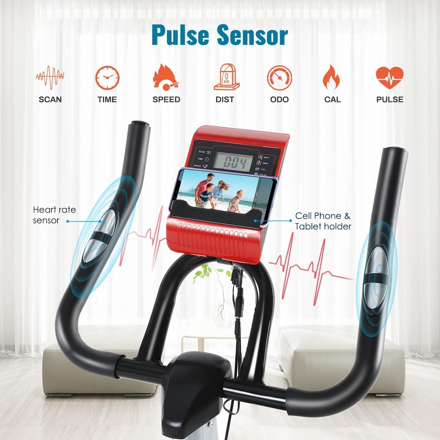 [Visible data] This stationary bikes for home or exercise bike is designed with the user’s exercise monitoring and entertainment needs in mind. The integrated sensors on the handlebars capture and display a number of key exercise data in real time, including pulse, time, speed, calories burned, and odometer, allowing users to keep track of their exercise status for a more scientific and effective workout.In addition, the exercise bikes for home is equipped with a stand that makes it easy for users to place their phones or tablets on it. This makes it easy to watch instructional videos, listen to music, or view exercise data, greatly enhancing the fun and convenience of exercise.