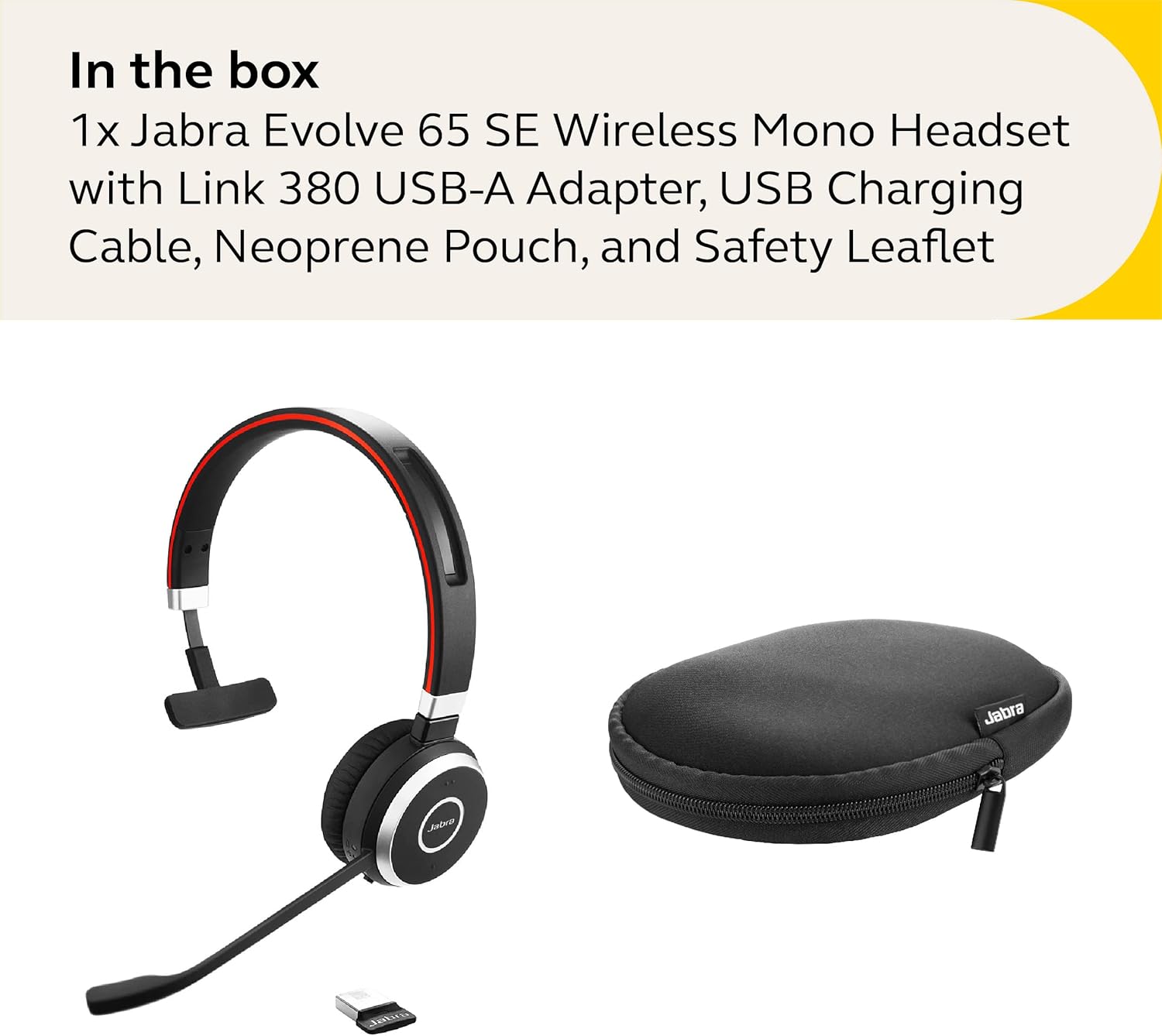 IN THE BOX — 1x Jabra Evolve 65 SE Wireless Mono Headset with Link 380 USB-A Adapter, USB Charging Cable, Neoprene Pouch, and Safety Leaflet. Headset Weight: 282g / 9.95oz, Color: Black