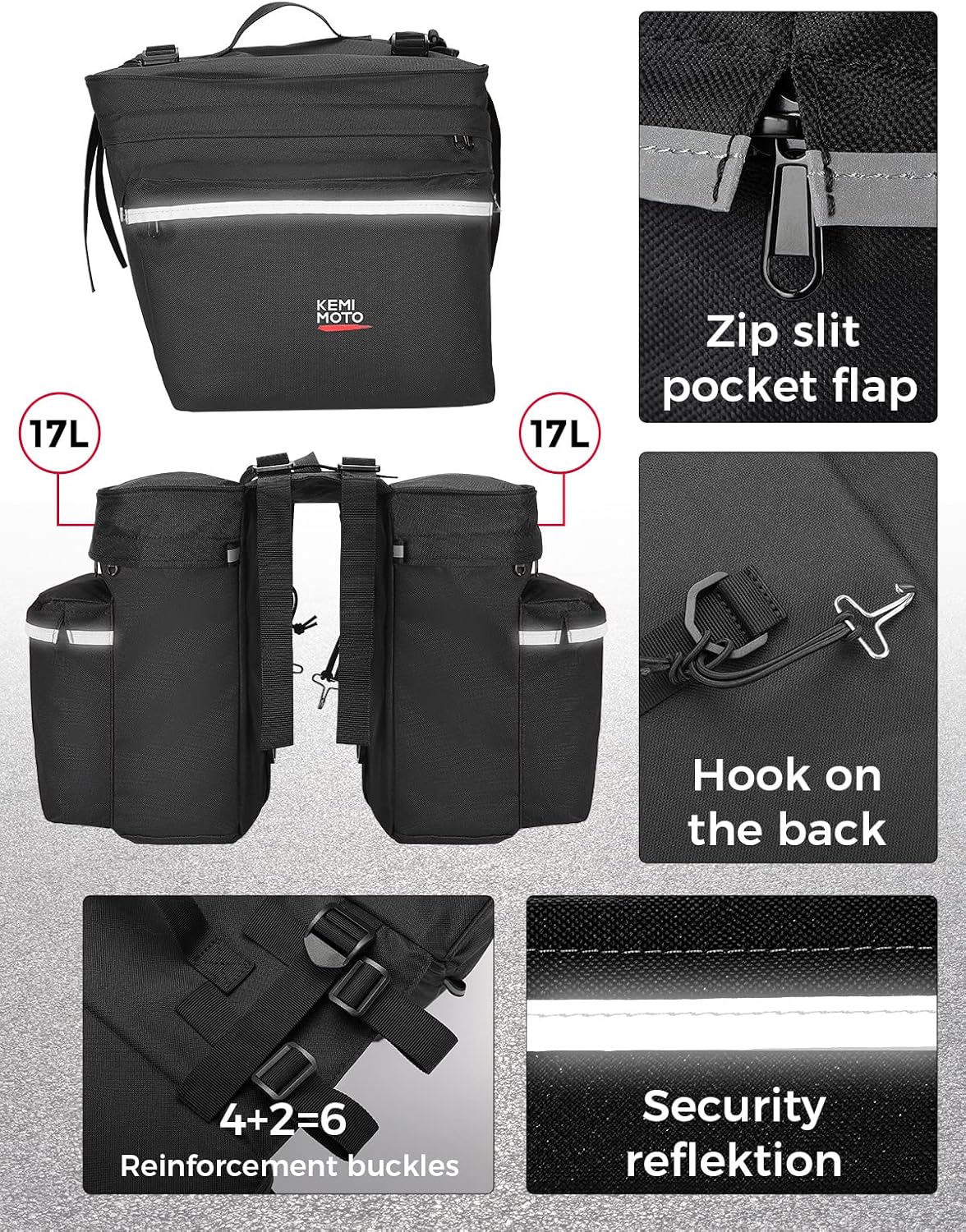 Large 34L Capacity: This Kemimoto bike bag has been upgraded to a large capacity of 17L per bag, and the total capacity of 2 bags is UP to 34L. Includes 2 main compartments for each bag. Plus the 2 pockets on the outside, ideal storage for daily essentials, biking gear, cycling accessories. Ideal for grocery, commuting, and outdoor trips