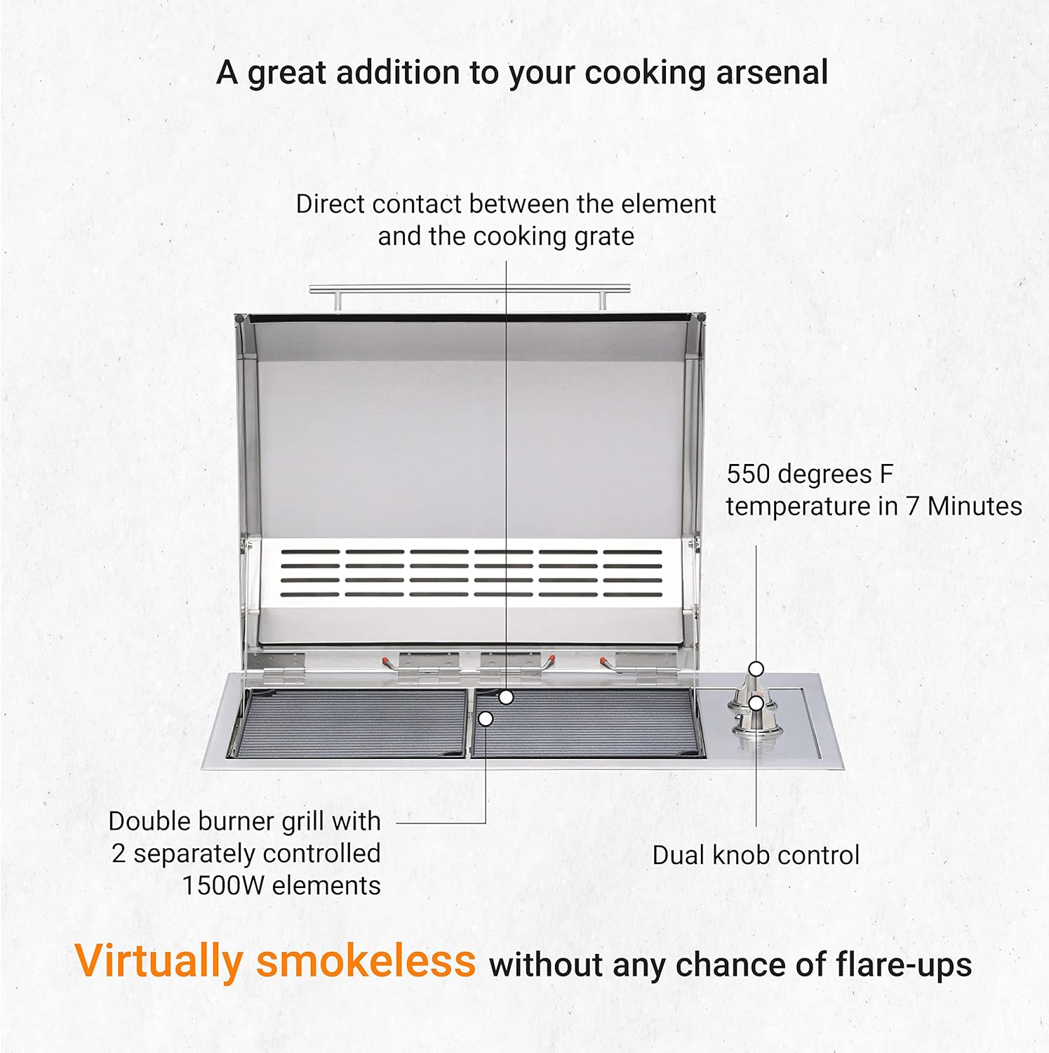 Stainless Steel Body: Developed with premium-quality marine-grade 304 stainless steel, our indoor and outdoor electric grill is weather-resistant and holds a lifetime rust-proof guarantee.