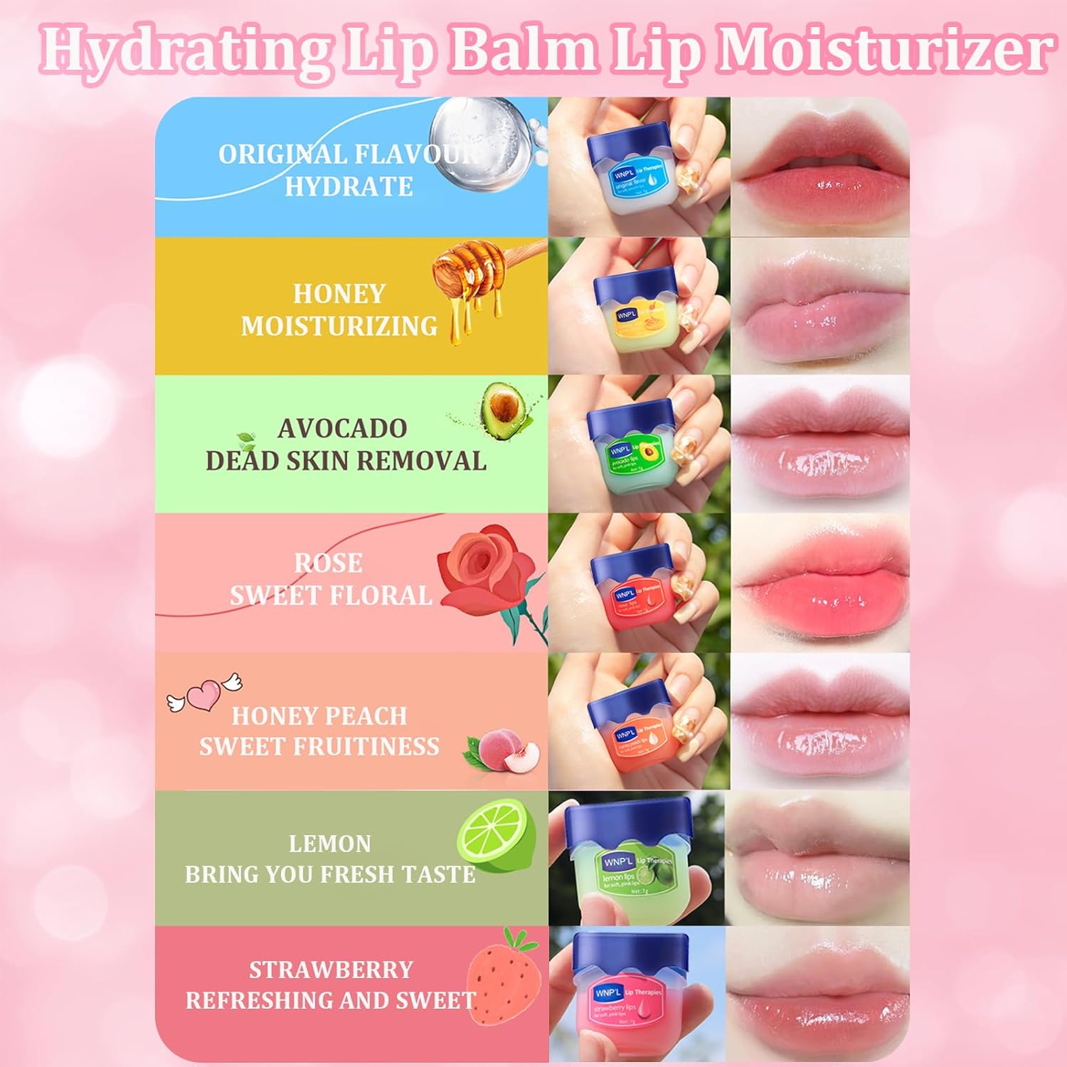 【Hydrating Lip Balm】The hydrating lip balm set including original, honey, avocado, rose, sakura and peach. ingredients include Fruit extract, honey extract, selected jojoba seed oil, vitamin E to keep your lips hydrated all day long.