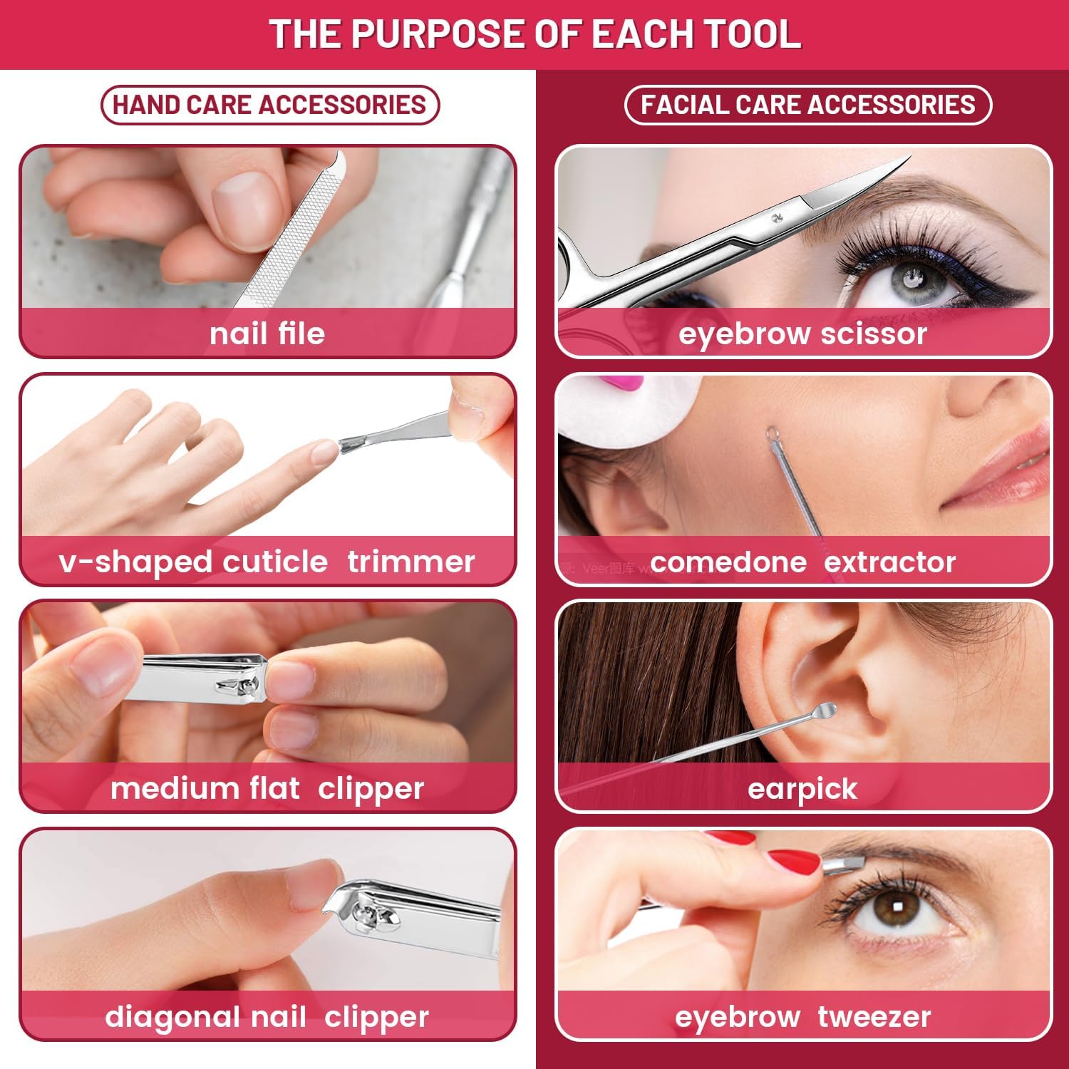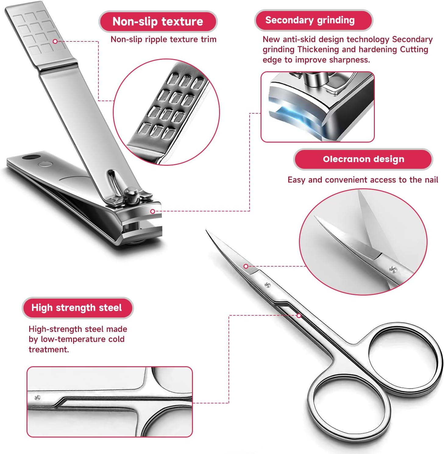 Multi-functional Nail Clipper: Large and small clippers for fingernails and toenails, ensuring precise cuts for every size. These kits go beyond just nails! Many include tools for eyebrow shaping, facial care, and even callus removal, making them a truly one-stop shop for self-care.