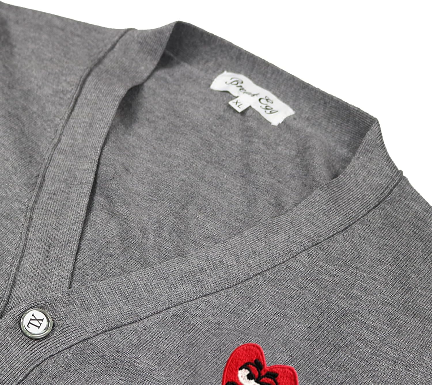 Break Egg Men Cardigan V-neck Red Snag Eyes Heart Embroidery Cotton with Button Solid Casual Fit Open Front Sweater