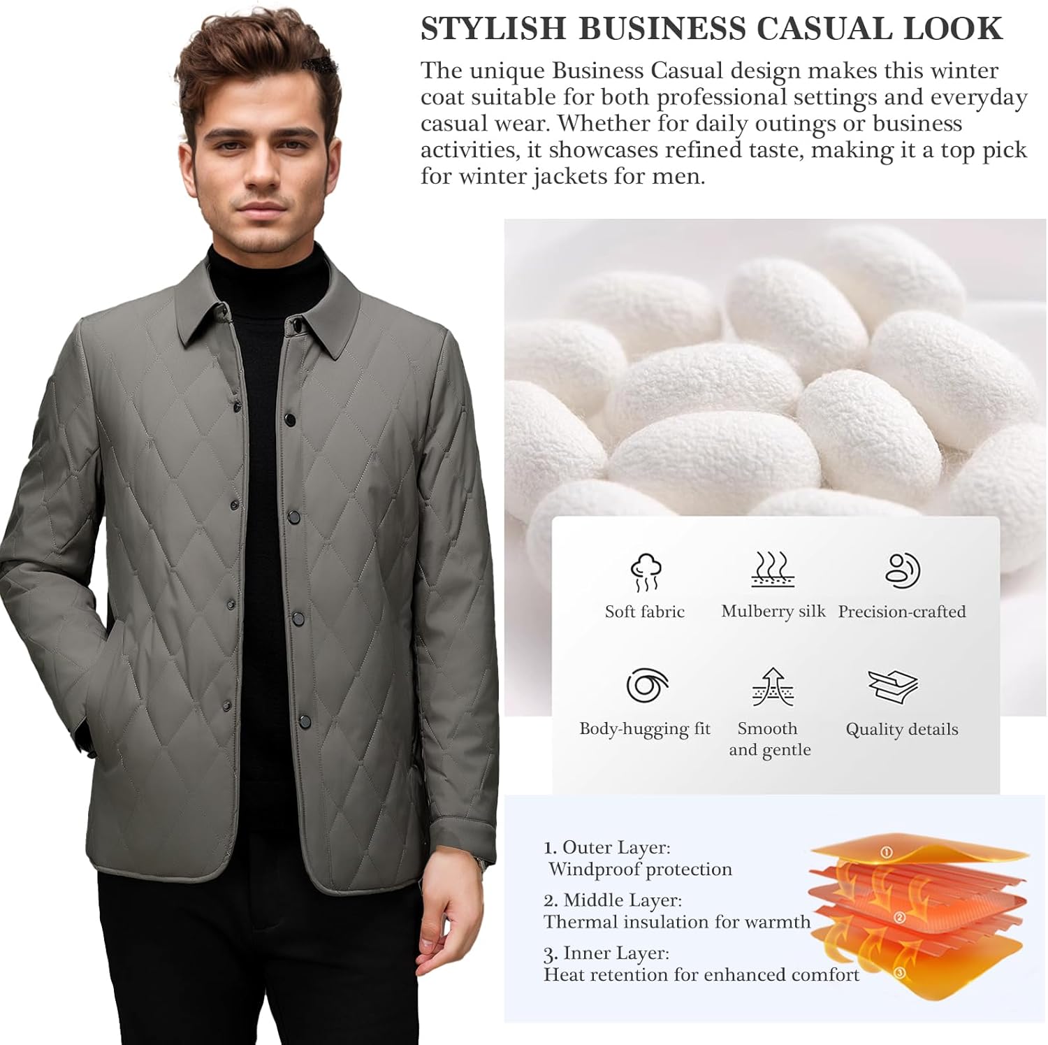 Mens Quilted Jacket Warm Silk Filled Winter Jacket Lightweight Fall Jackets Business Casual Windproof Coat for Men