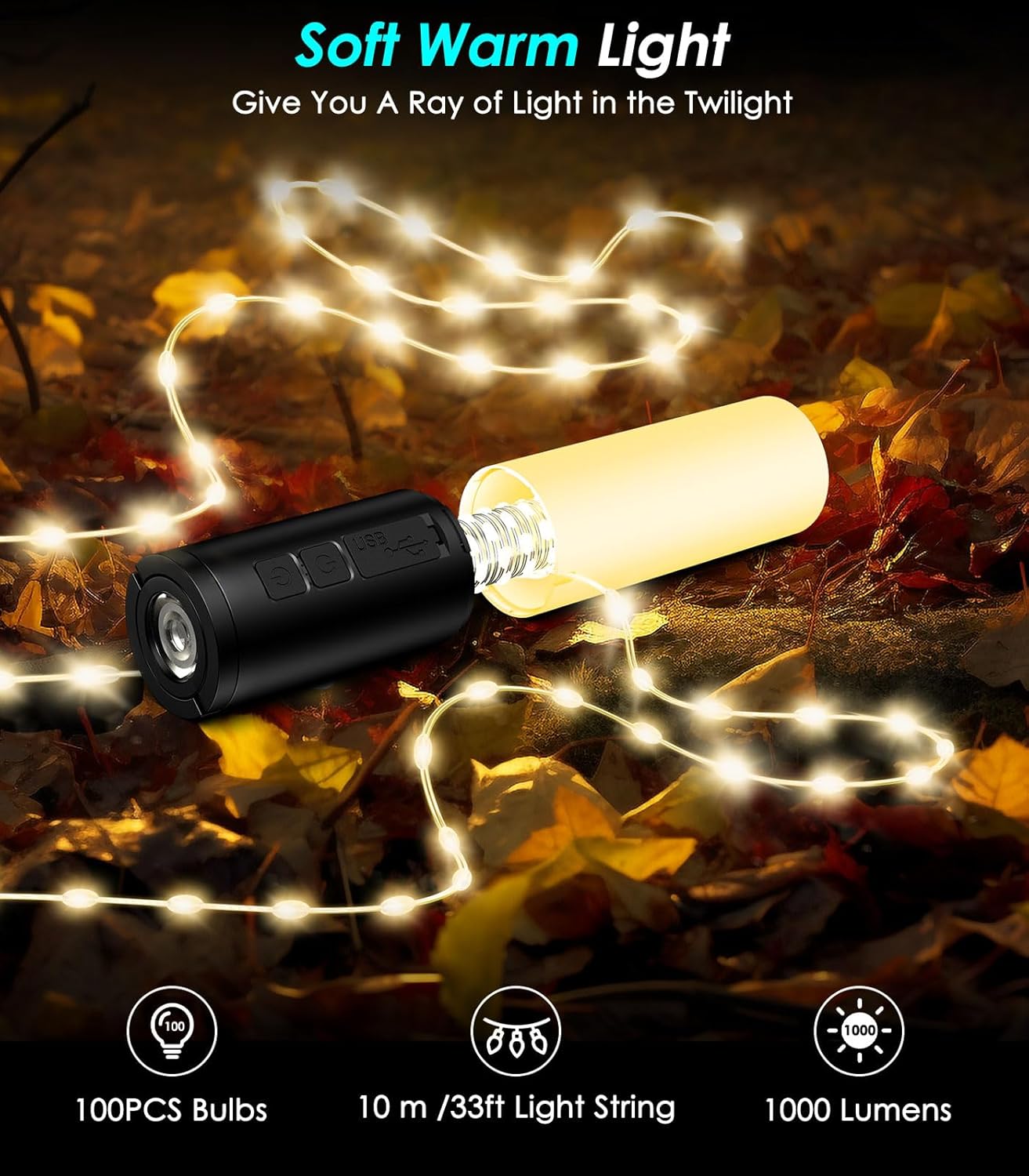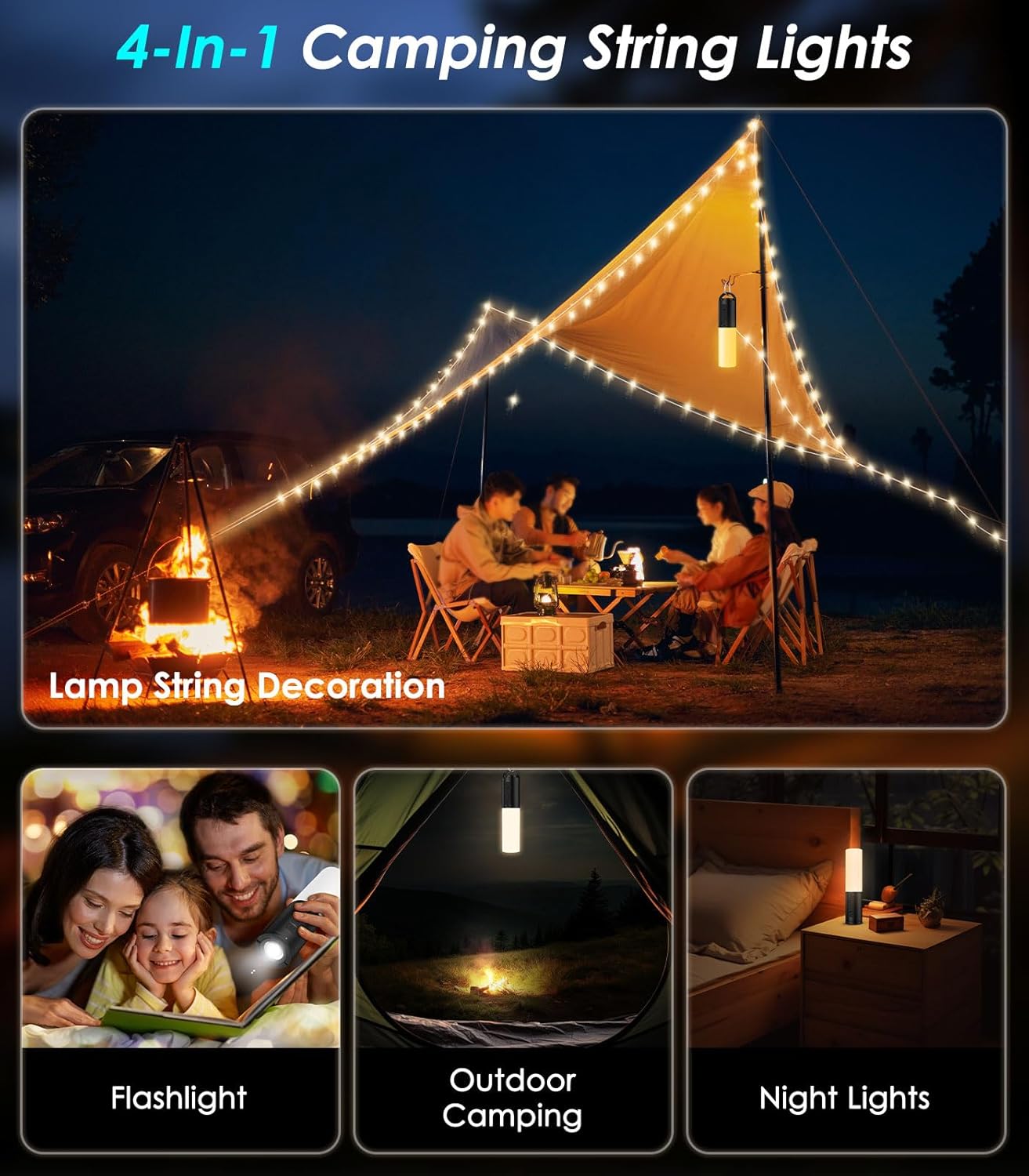 4 IN 1 MULTIFUNCTIONAL CAMPING LIGHTS: This camping accessories features lamp string decoration, flashlight, outdoor camping lantern and night light, which are perfect for various occasions on a camping trip. The 33ft light strings can be used to decorate tents, flashlights can provide bright lighting, and lanterns can serve as night lamps. Multifunctional lantern give you a enjoyable adventure.