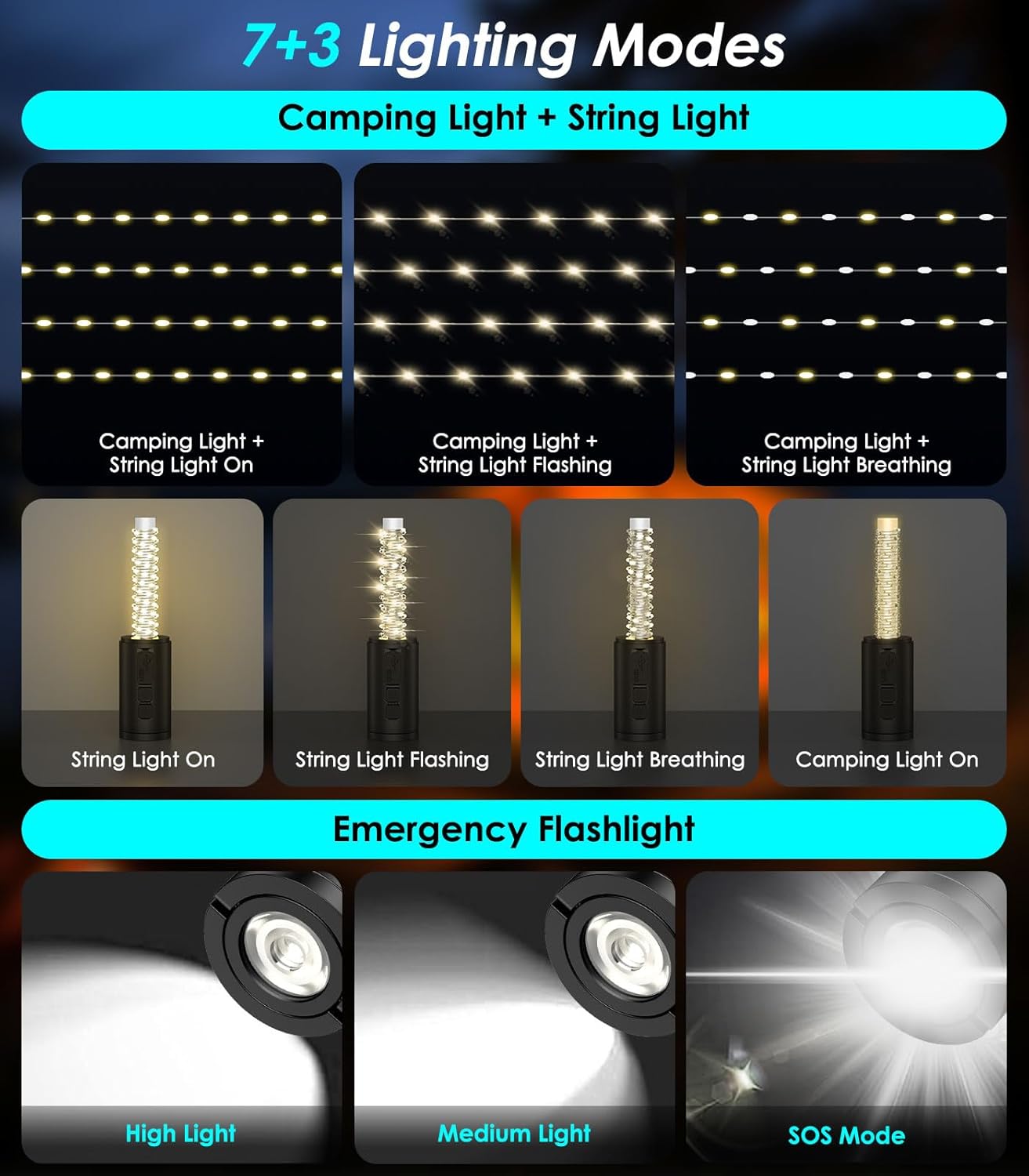 10 AMBIENCE LIGHTING MODES: This camping light has 7+3 modes to choose from: 7 modes for camping lights + string lights, 3 modes for flashlight. (After 5 seconds of lighting in any mode, press the switch to turn off. ) 10 different lighting modes give you a different viewing experience, creating a cozy and romantic atmosphere for you to relax and unwind under the “stars”.